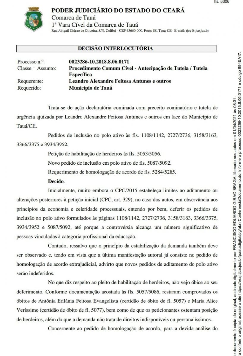 O Juiz Dr. Francisco Eduardo Girão Braga, que está respondendo pela 1ª Vara da Comarca de Tauá emitiu despacho em ação relacionada aos precatórios do Fundef do Município de Tauá, movida por um grupo de servidores da Educação.