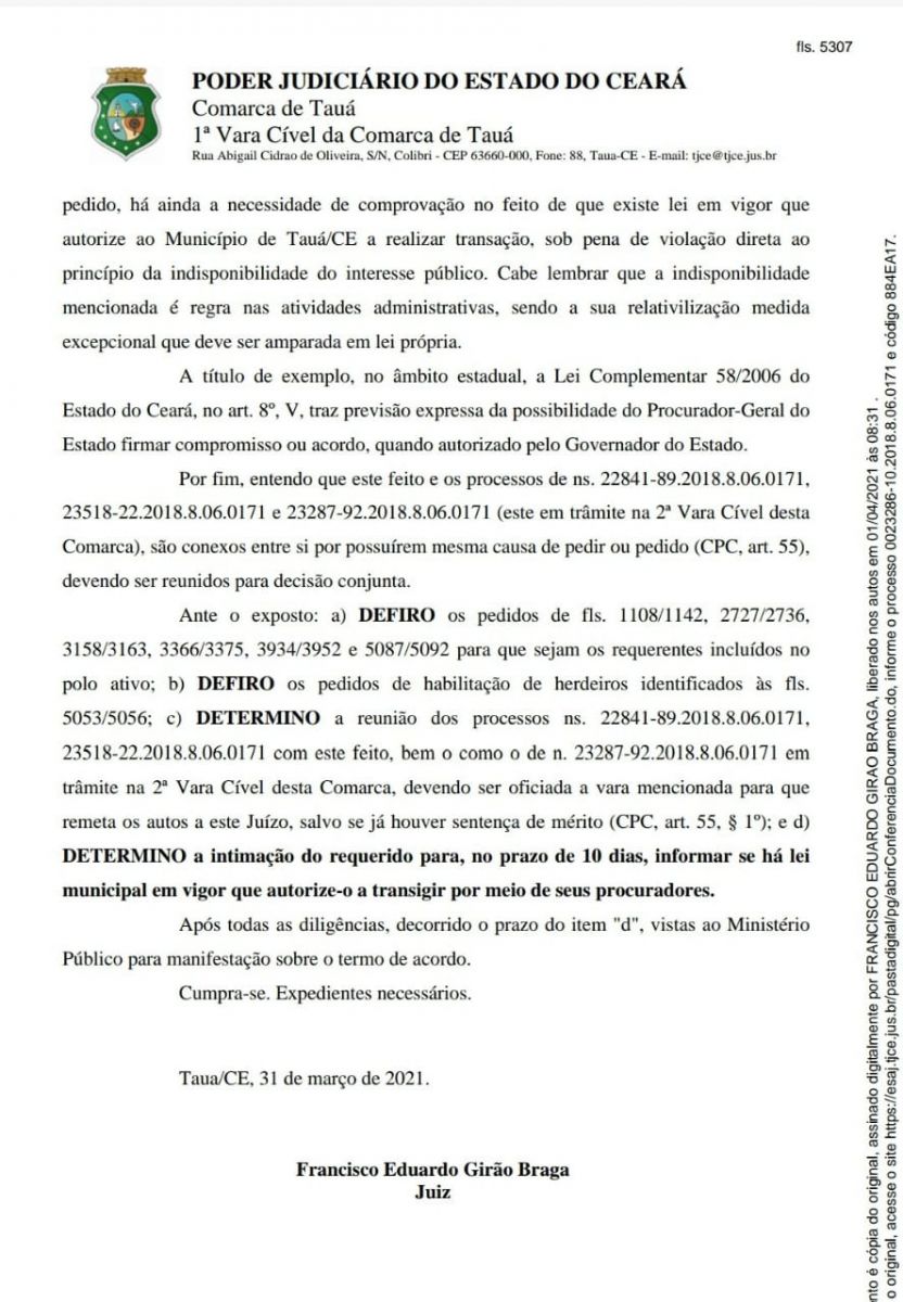 Quanto ao pedido de homologação do acordo, o magistrado entendeu que "há ainda a necessidade de comprovação no feito de que existe lei em vigor que autorize ao Município de Tauá/CE a realizar transação, sob pena de violação direta ao princípio da indisponibilidade do interesse público. Cabe lembrar que a indisponibilidade mencionada é regra nas atividades administrativas, sendo a sua relativilização medida excepcional que deve ser amparada em lei própria", diz trecho do Despacho e deteminou um prazo de 10 dias para o Município se manifestar sobre a existência de lei que autorize o município a realizar a transação e demais informações sobre o tema.
