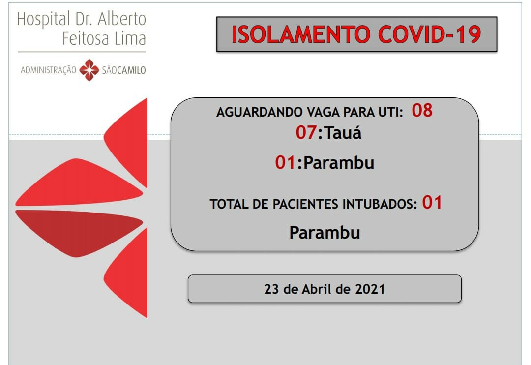 Oito pacientes estão na fila de espera por vaga na UTI do Hospital Dr. Alberto Feitosa Lima, em Tauá, segundo boletim divulgado na noite de hoje(23). Desses, 7 são de Tauá e um do Município de Parambu.