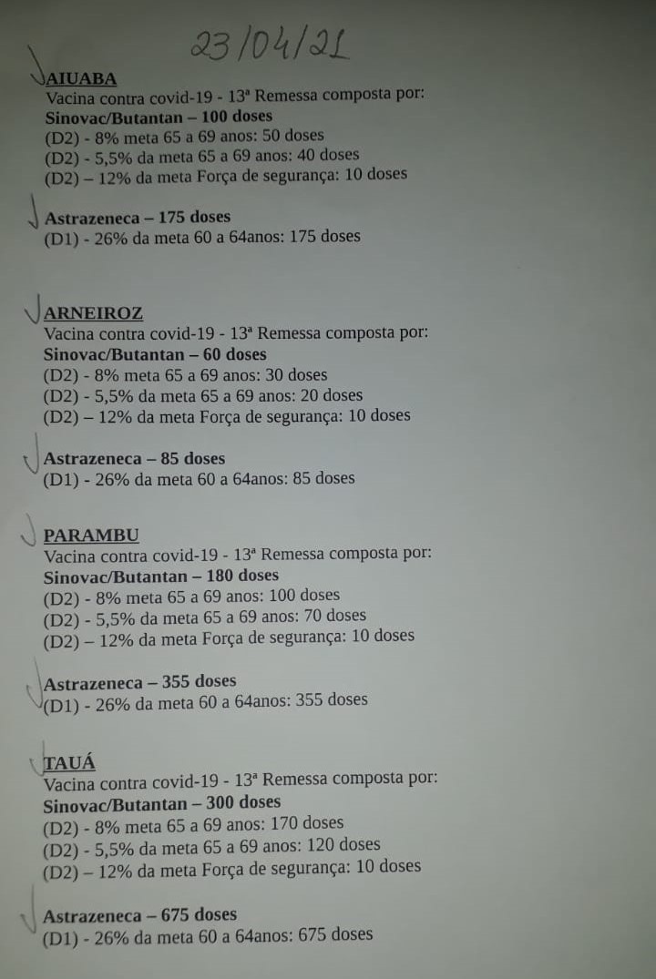As doses contra o coronavírus correspondem a 300 da Coronac/Butantan e 675 doses da Oxford/Astrazeneca, permitindo que a partir de segunda-feira(26), seja iniciada a vacinação de idosos de 64 anos de idade. Tauá já aplicou 97% das doses de vacinas recebidas contra a Covid.