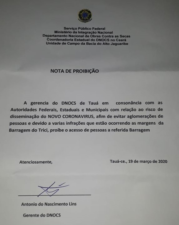 O acesso de pessoas à Barragem do Trici, em Tauá, está proibido, segundo decisão do Dnocs. A medida foi anunciada nesta quinta-feira(19), com o objetivo de evitar aglomerações devido ao risco de contaminação pelo coronavírus e diversas infrações que estão sendo praticadas no local.