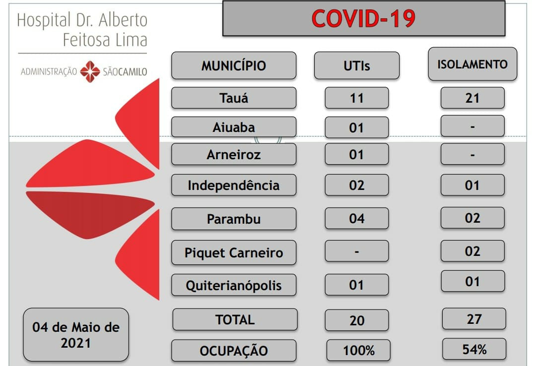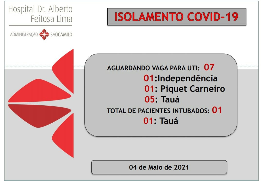 Já o boletim hospitalar informa aumento a fila de espera por leitos de UTI no Hospital Dr. Alberto Feitosa Lima. Comparado ao boletim da última segunda-feira(03), o número de pacientes aguardando vaga passou de 5 para 7.