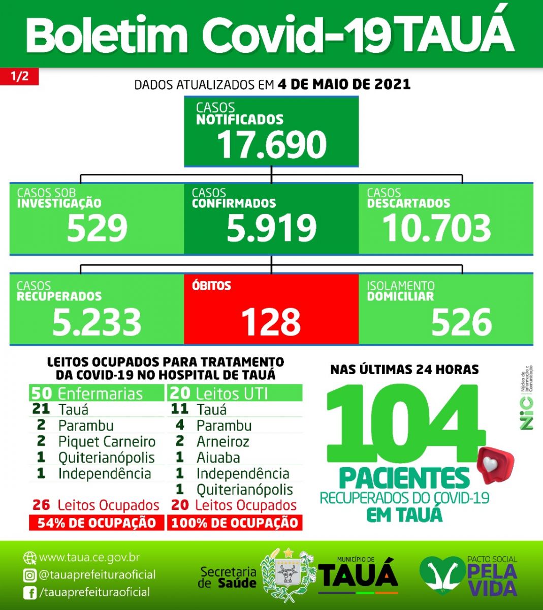 Mais dois óbitos por coronavírus foram contabilizados pela Secretaria de Saúde do Município de Tauá em boletim epidemiológico divulgado na noite de ontem(04). Desde o início da pandemia, 128 pessoas morreram.
