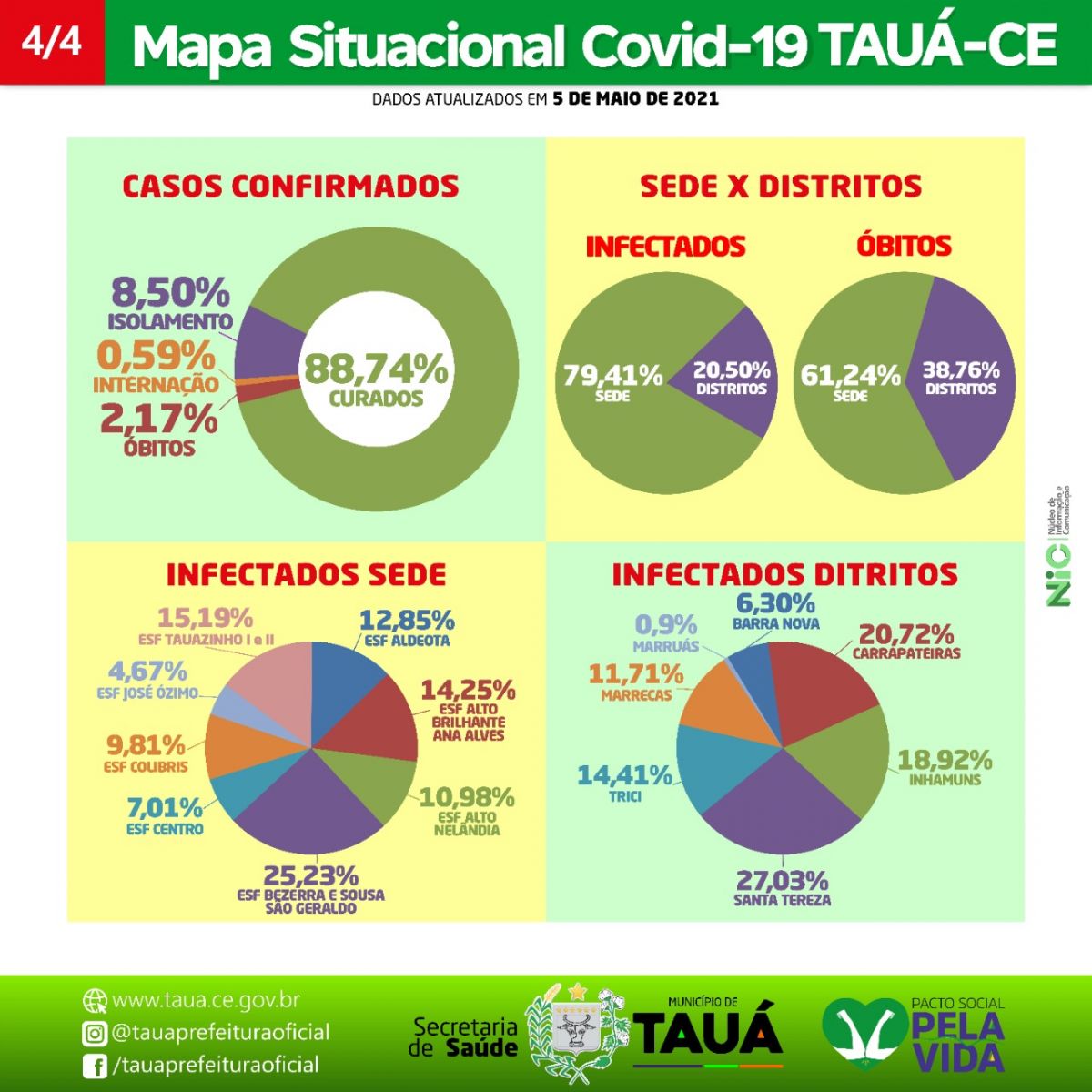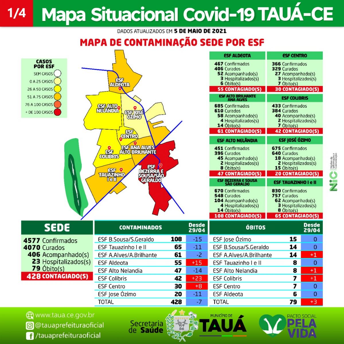 Divulgado na manhã de hoje(06), pela Secretaria Municipal de Saúde, o Mapa Situação da Covid nos Bairros e Distritos de Tauá. A área que abrange os Bairros, São Geraldo e Bezerra e Sousa lidera com um total de casos na Sede e o Distrito de Santa Teresa, na zona rural, com 30 registros.