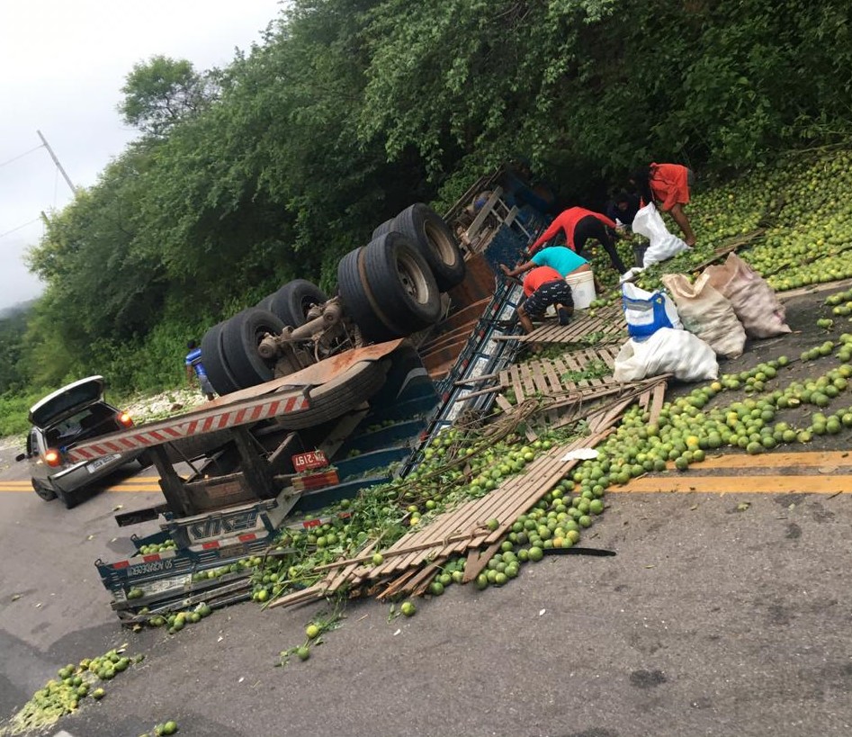 Um caminhão Mercedes Benz, cor azul, placas PAM 2195-Cristinapolis/Sergipe, que transportava carga de laranja vinda de São Paulo com destino Fortaleza, capotou na madrugada desta sexta-feira(20), na BR 020, altura da ladeira das Guaribas, no município de Parambu, próximo a divisa CE/PI.