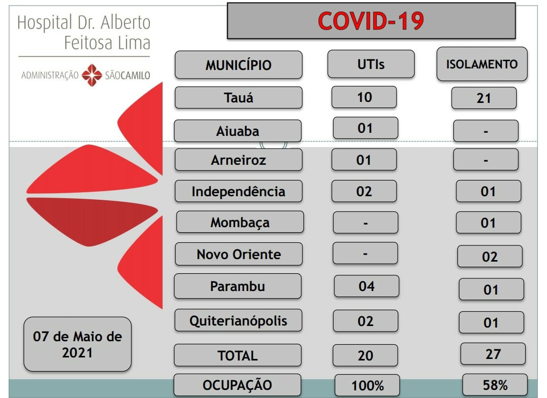 O Hospital Dr. Alberto Feitosa Lima também divulgou hoje(07), um boletim atualizando as informações sobre a fila de espera por leitos e taxa de ocupação de leitos de UTI e Enfermaria-Covid.