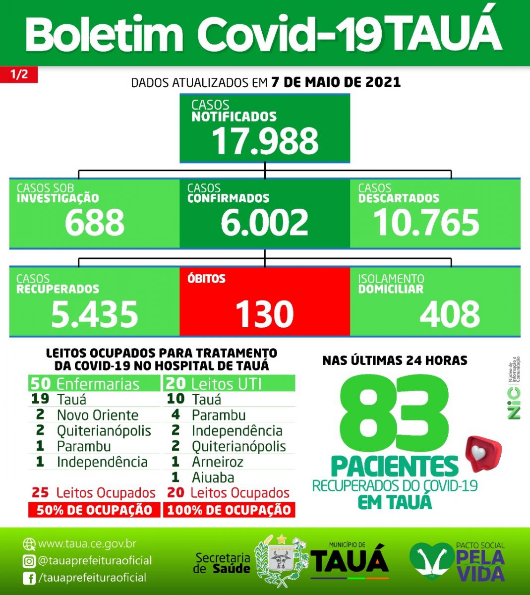 A Secretaria de Saúde informou que Tauá atingiu o segundo menor índice de tauaenses infectados e o menor índice de internados na UTI dos últimos 17 dias.
