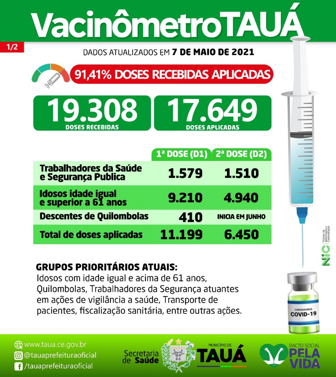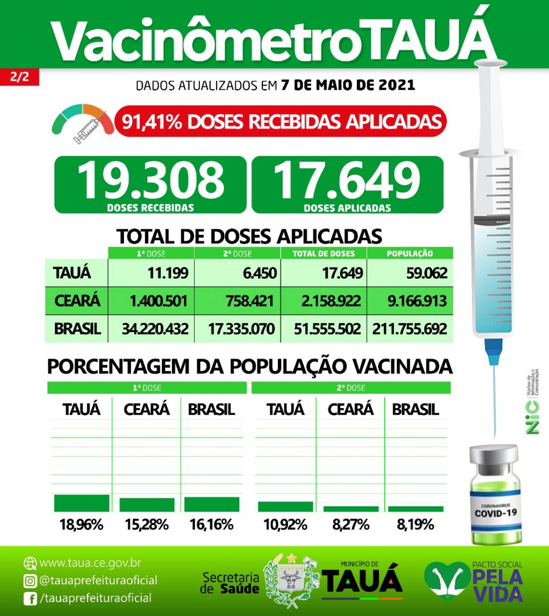 O município de Tauá está acima da média nacional e estadual no ritmo da vacinação contra a Covid-19. O percentual de vacinação a nível Brasil está em 16,16%, no Ceará a média é 15,28% e em Tauá atingiu a meta de 18,96%.