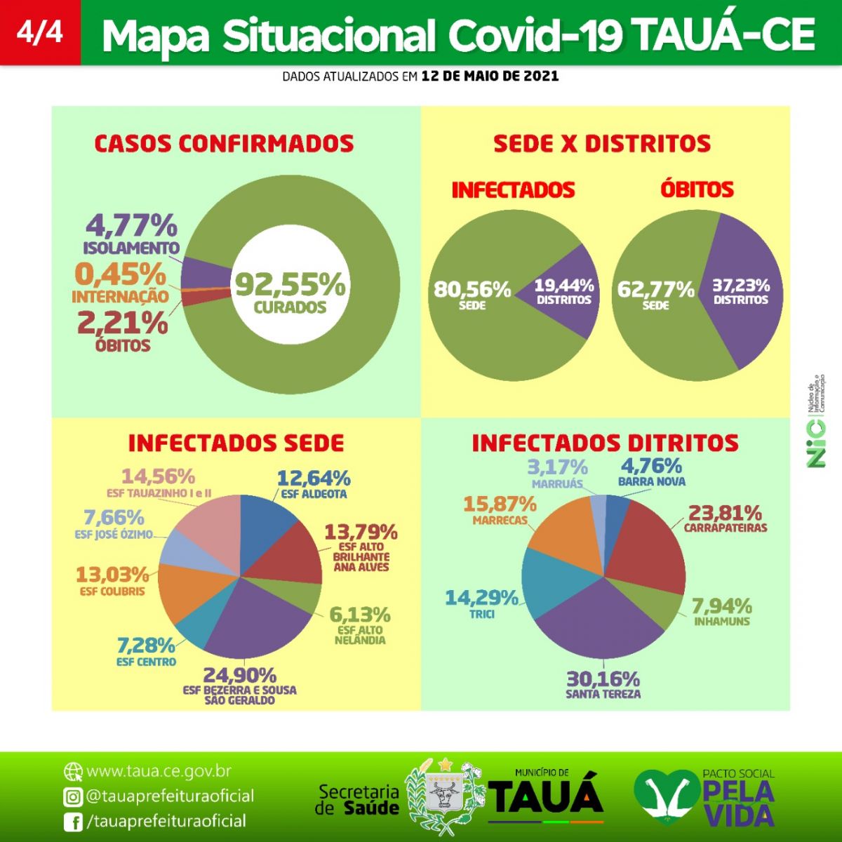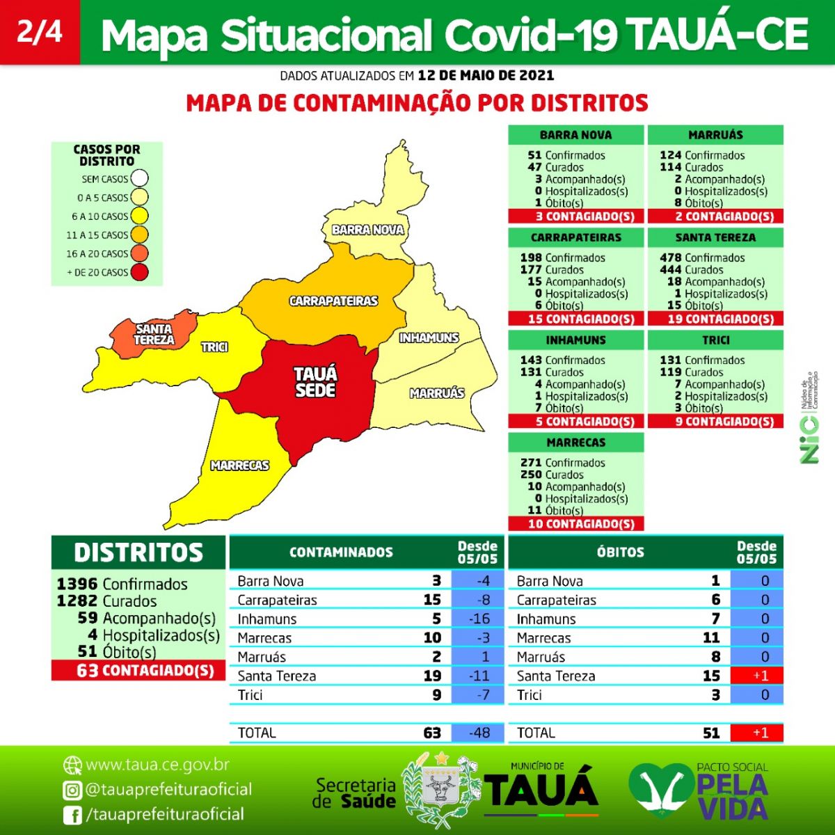 Os bairros que são abrangidos pelos ESFs Bezerra e Sousa, São Geraldo I e II, ainda continuam como o maior foco de contaminação na Sede com 65 casos (43 casos a menos que o índice do último mapa divulgado em 05 de maio), já no interior é o Distrito de Santa Tereza com 19 casos.