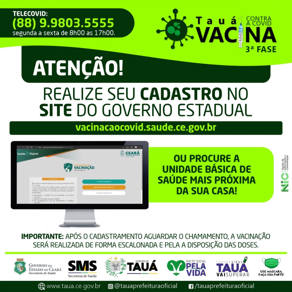 IMPORTANTE: APÓS O CADASTRAMENTO AGUARDAR O CHAMAMENTO, A VACINAÇÃO SERÁ REALIZADA DE FORMA ESCALONADA E PELA A DISPOSIÇÃO DAS DOSES.
