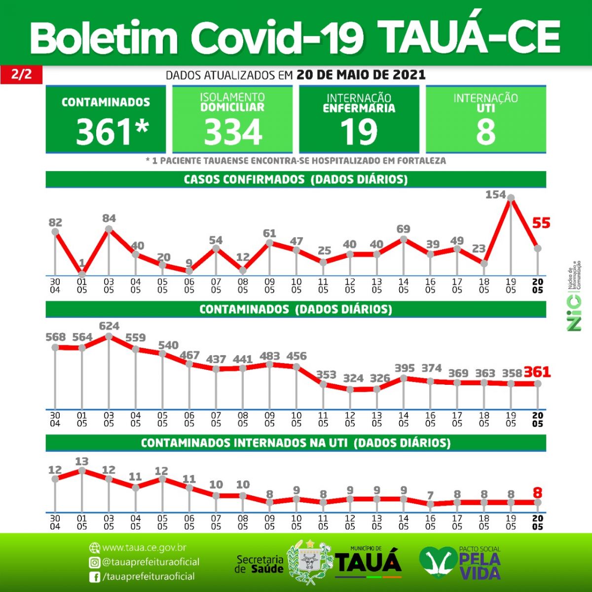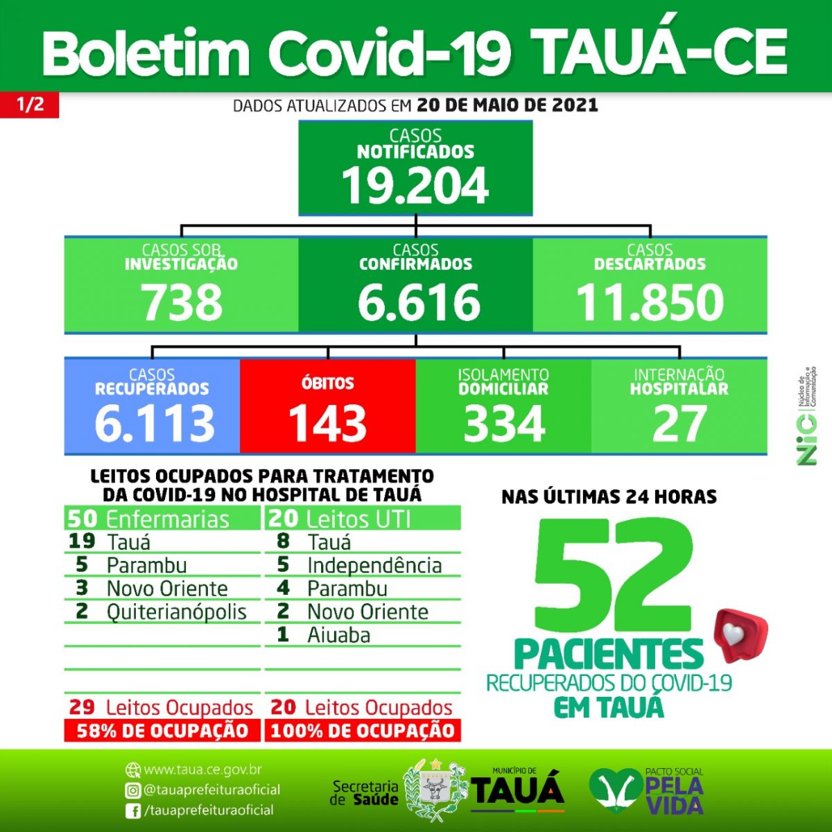 O Boletim Epidemiológico divulgado na noite de ontem(20), pela Secretaria de Saúde, contabiliza mais um óbito por Covid nas últimas 24h, passando para 143. Foram registrados ainda, 55 novos casos e 52 pacientes se recuperaram.