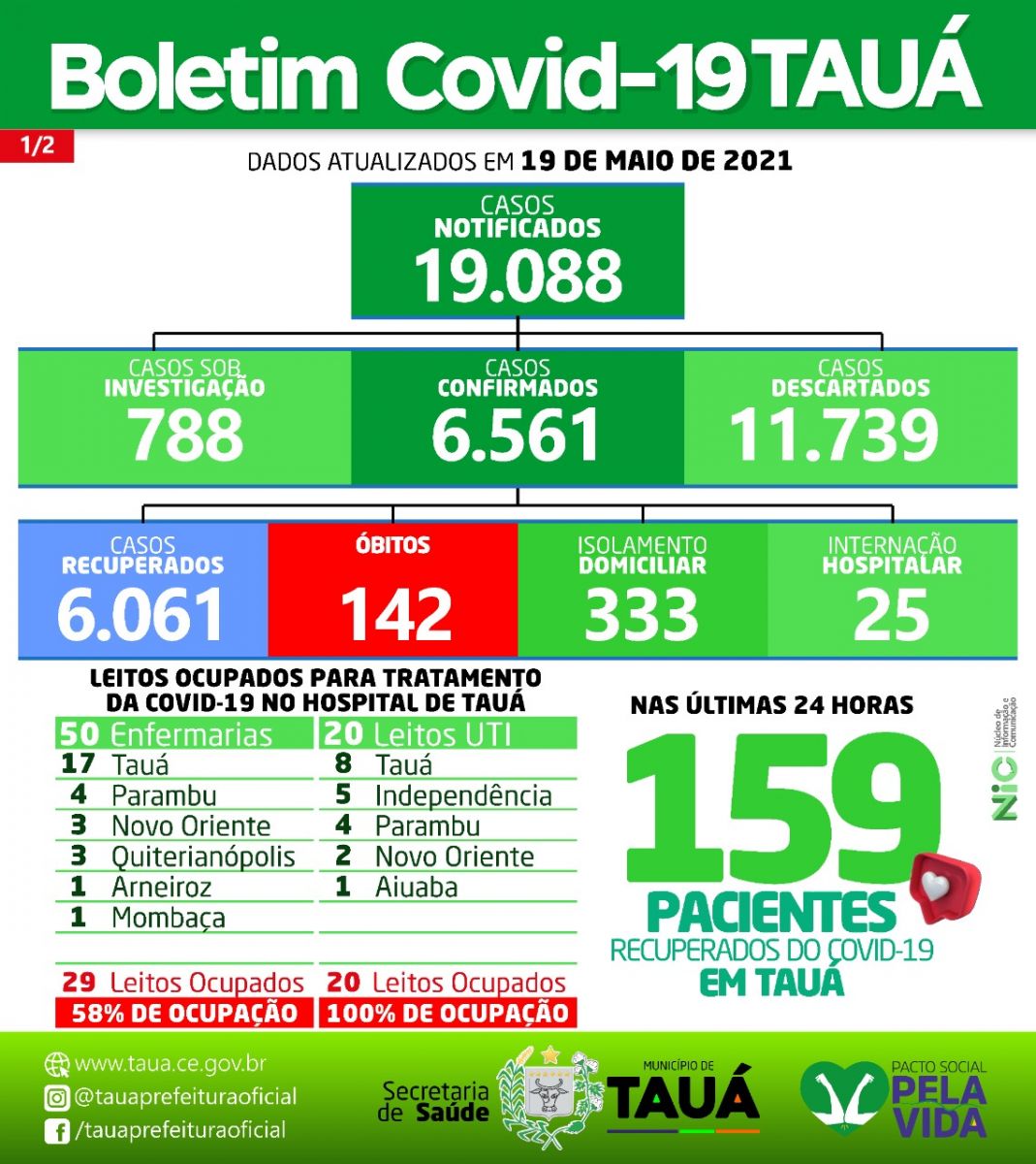 Os pacientes em tratamento domiciliar aumentaram de 333 para 334. Os pacientes internados na Enfermaria-Covid do Hospital Dr. Alberto Feitosa Lima são 17 e 8 estão internados na UTI.