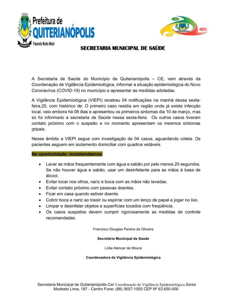 O secretário de Saúde de Quiterianópolis, Douglas Pereira, informou que todas as medidas estão sendo tomadas com base nas determinações do Ministério da Saúde. “Nossos profissionais estão acompanhando esses pacientes e passando todas as orientações necessárias”, destacou.