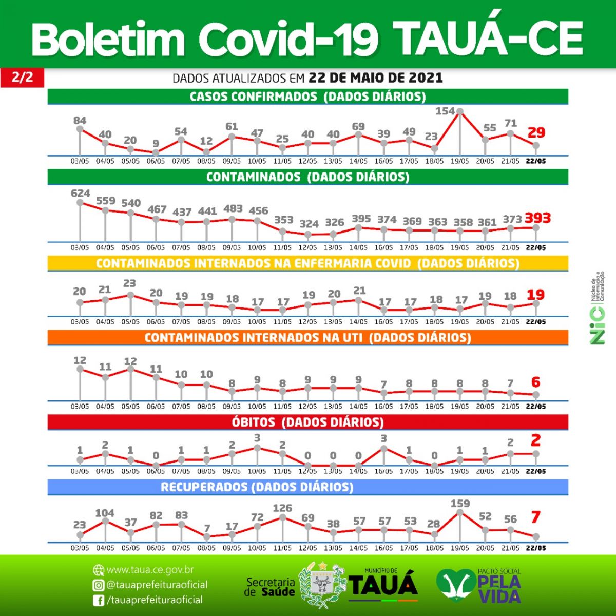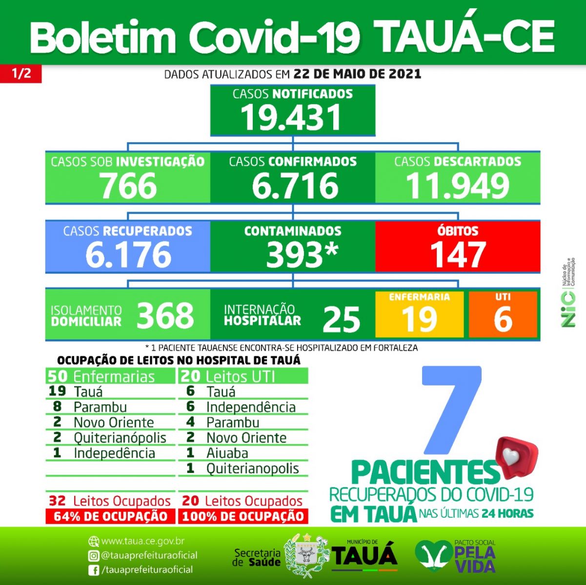 O Boletim Epidemiológico divulgado na noite de ontem(22), contabiliza mais dois óbitos por coronavírus no município de Tauá, elevando para 147, as mortes pela doença desde o início da pandemia.