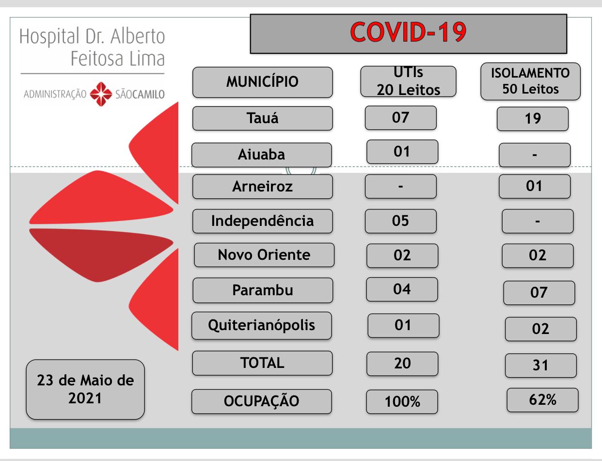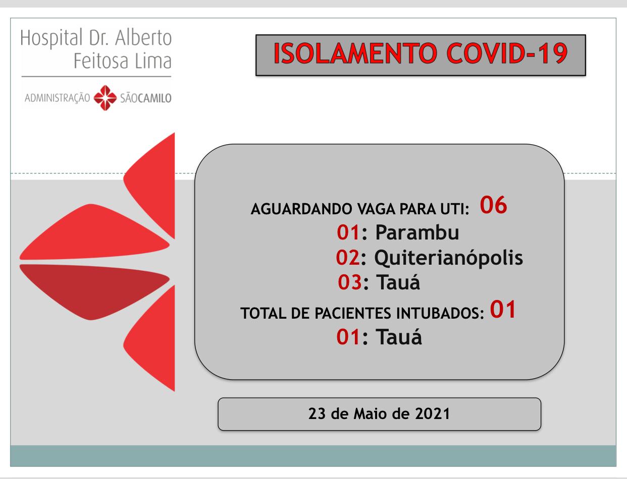 O boletim divulgado pelo Hospital Dr. Alberto Feitosa Lima aponta 06 pacientes na fila de espera por leito de UTI-COVID, sendo 03 de Tauá.