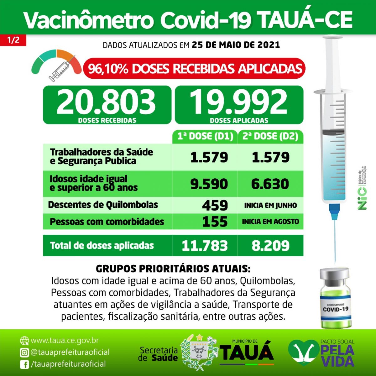 A Secretaria de Saúde do Município de Tauá atualiza os números da campanha de vacinação contra a Covid-19. Das 20.803 doses recebidas pelo município, foram aplicadas 19.992, totalizando 96,10% das doses aplicadas.