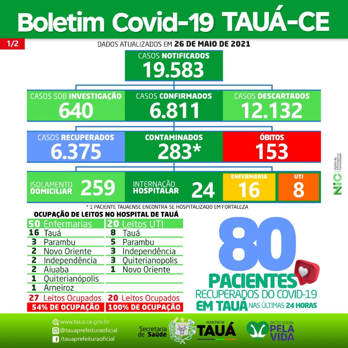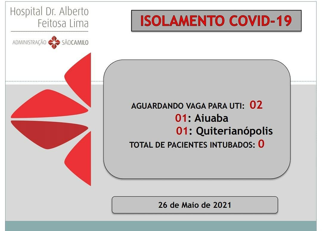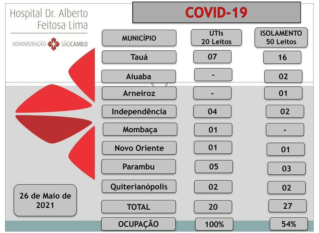 Boletim divulgado hoje(26), pelo Hospital de Tauá, informa que dois pacientes estão na fila de espera por leito de UTI-COVID. Um de Aiuaba e outro de Quiterianópolis.