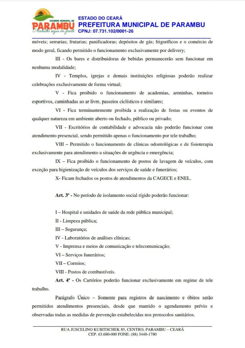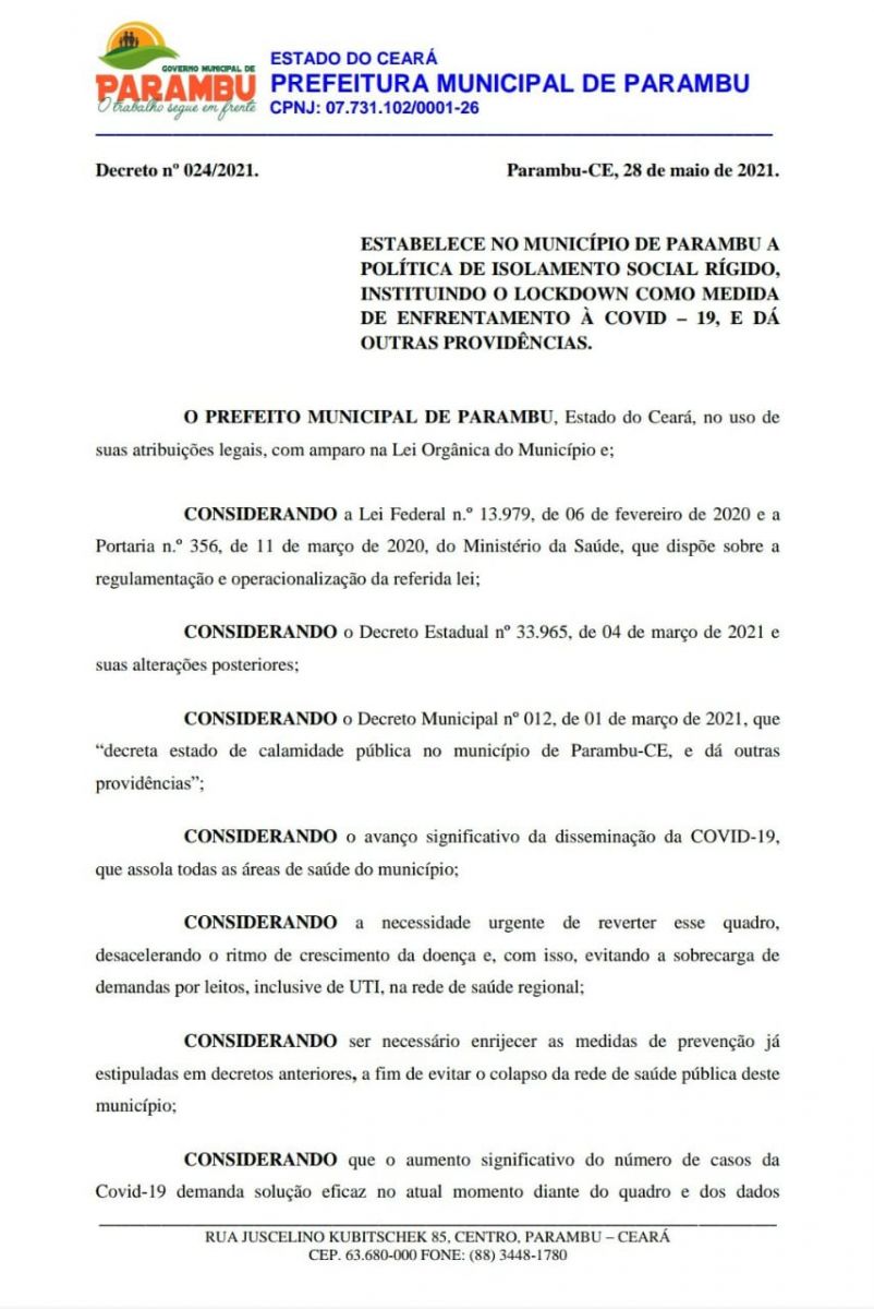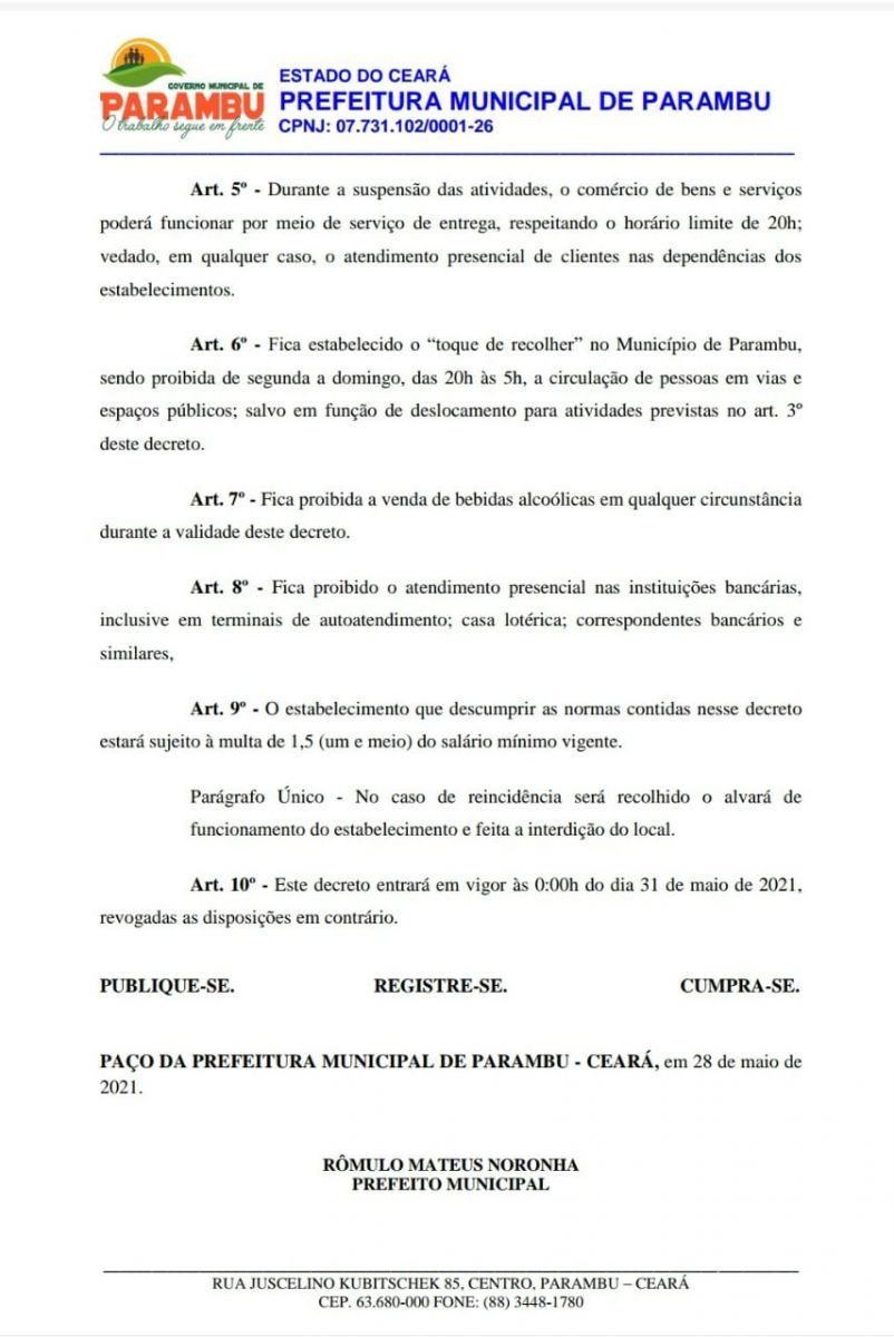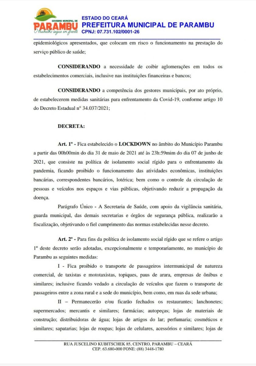 Decreto assinado hoje(28), pelo prefeito de Parambu, Rômulo Noronha, estabelece lockdown no município a partir de segunda-feira(31 de maio), devido ao avanço na pandemia, que até ontem(27), registrou 55 mortes e vários casos de Covid.