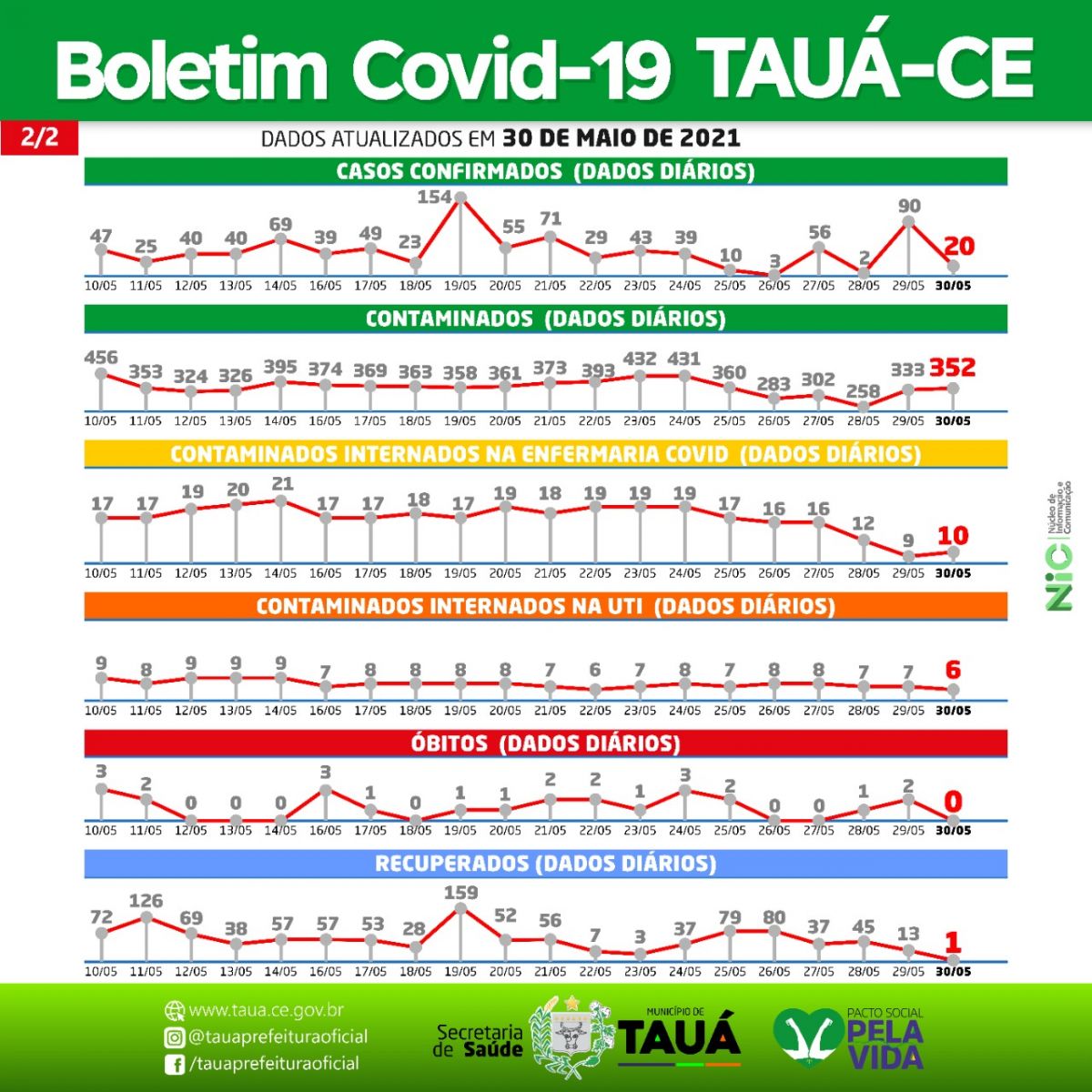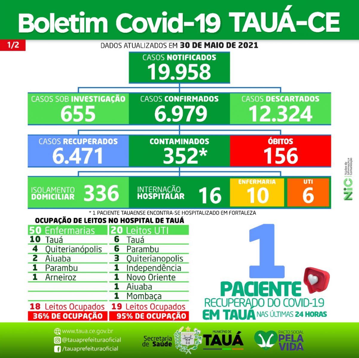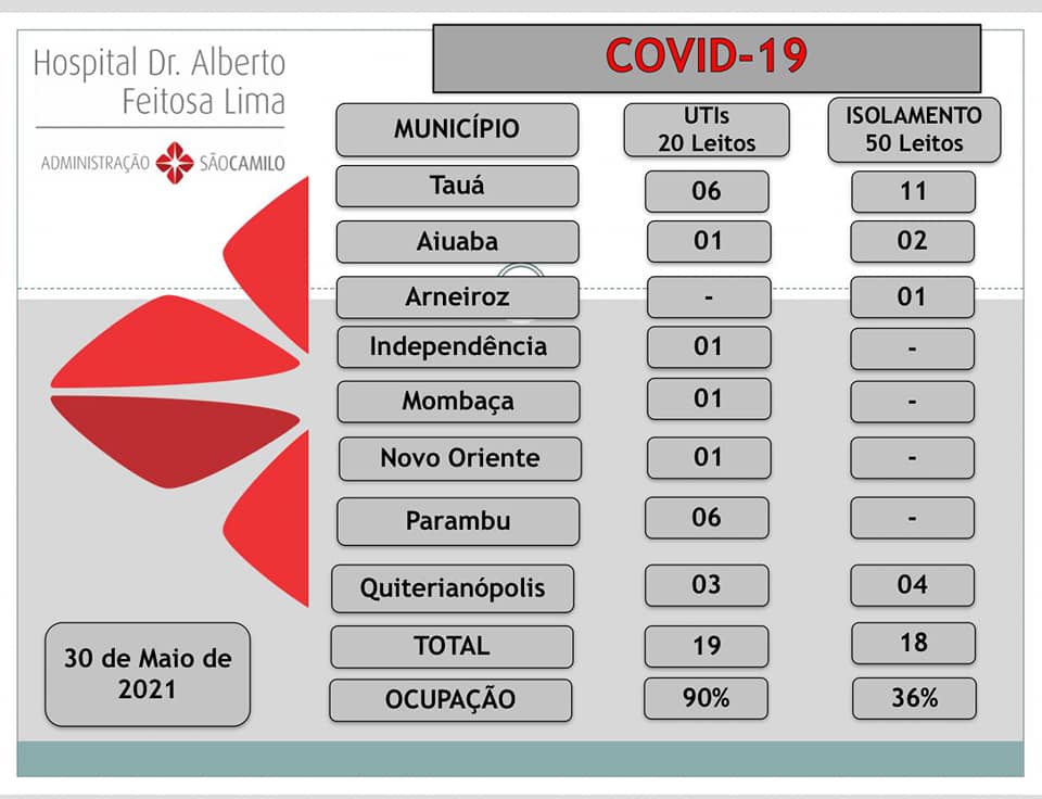 Na Unidade de Terapia Intensiva, 6 tauaenses estão internados e a taxa de ocupação de leitos diminuiu para 90%(após várias semanas com ocupação total). Já na Enfermaria-Covid, 11 pacientes estão em recuperação. Os demais são de outros municípios da região.