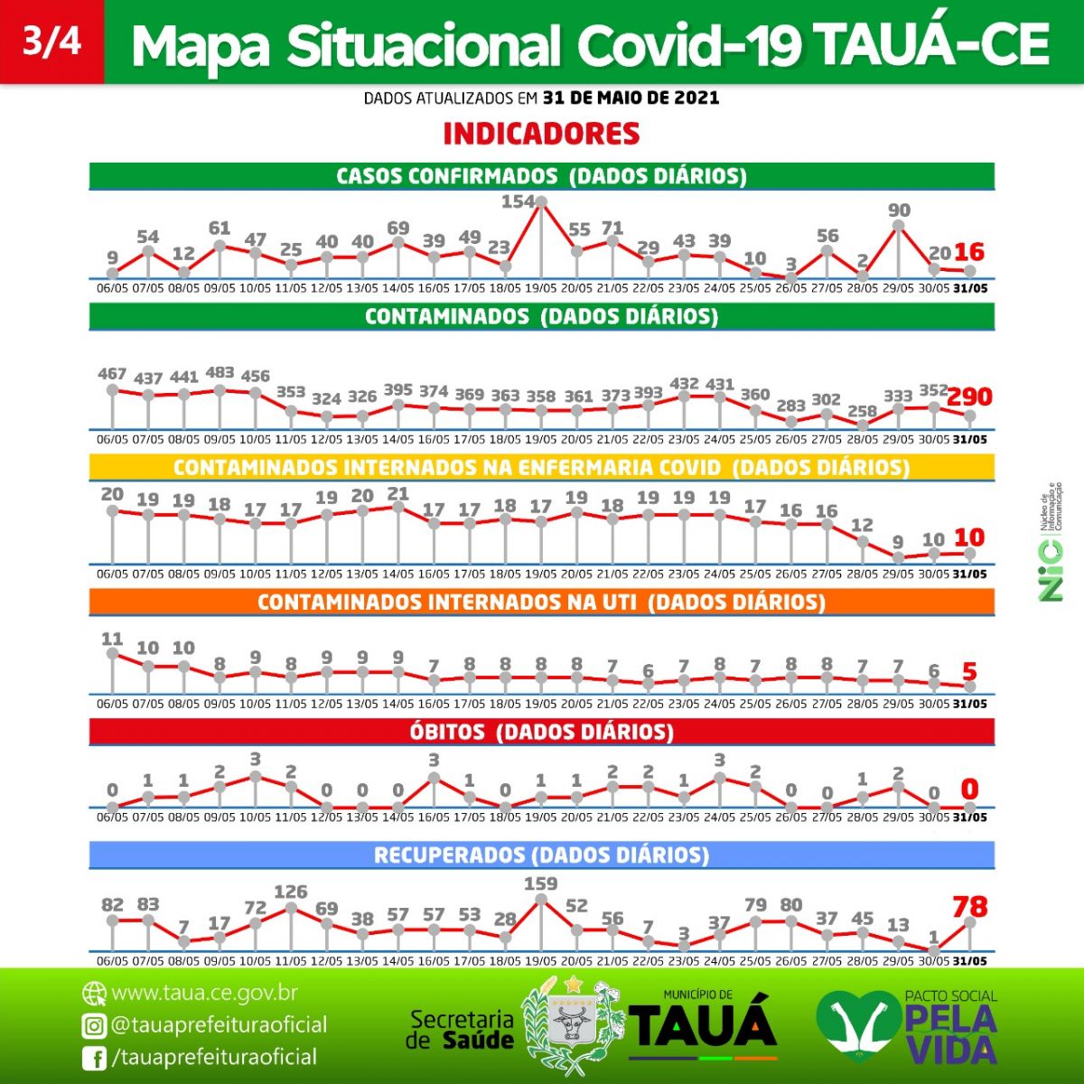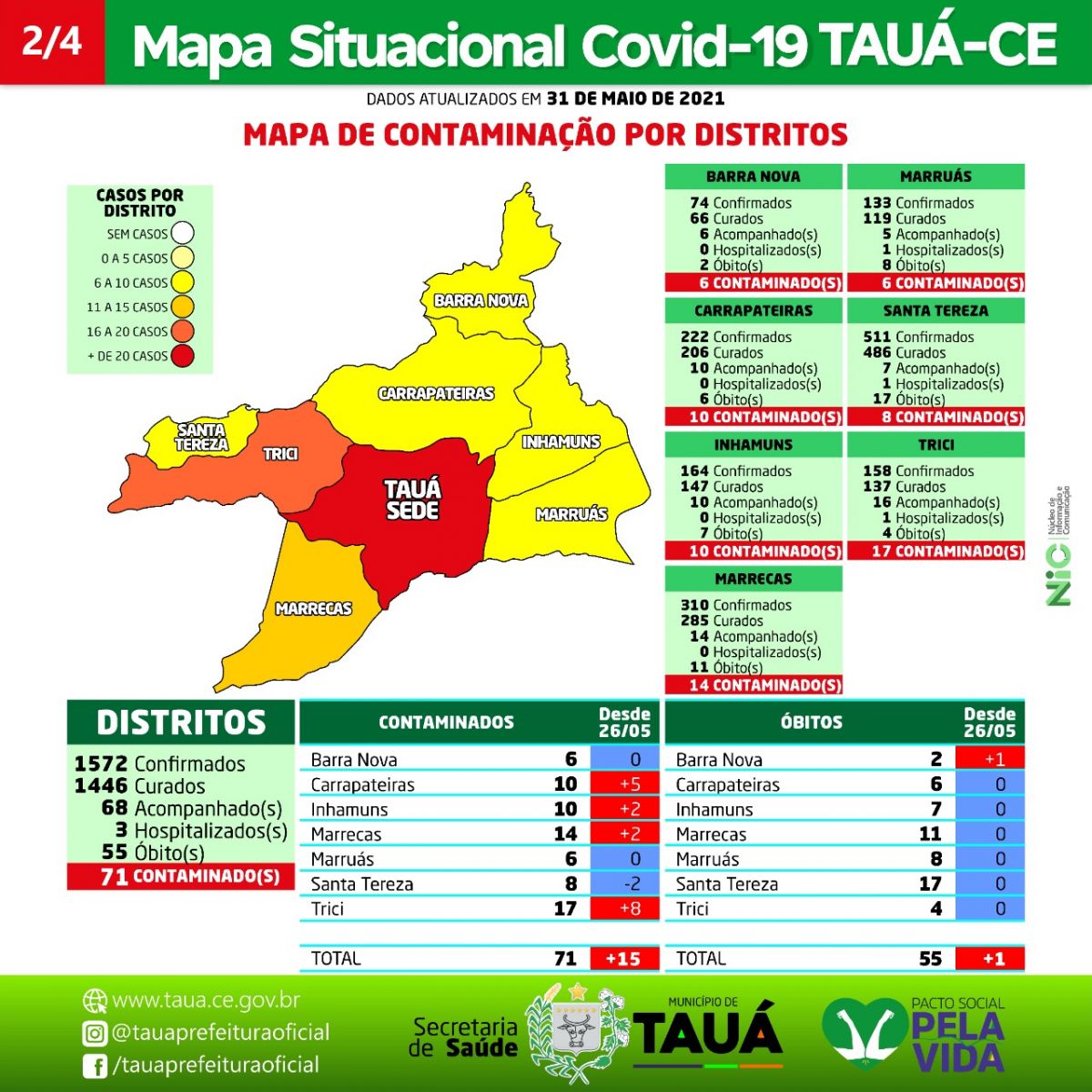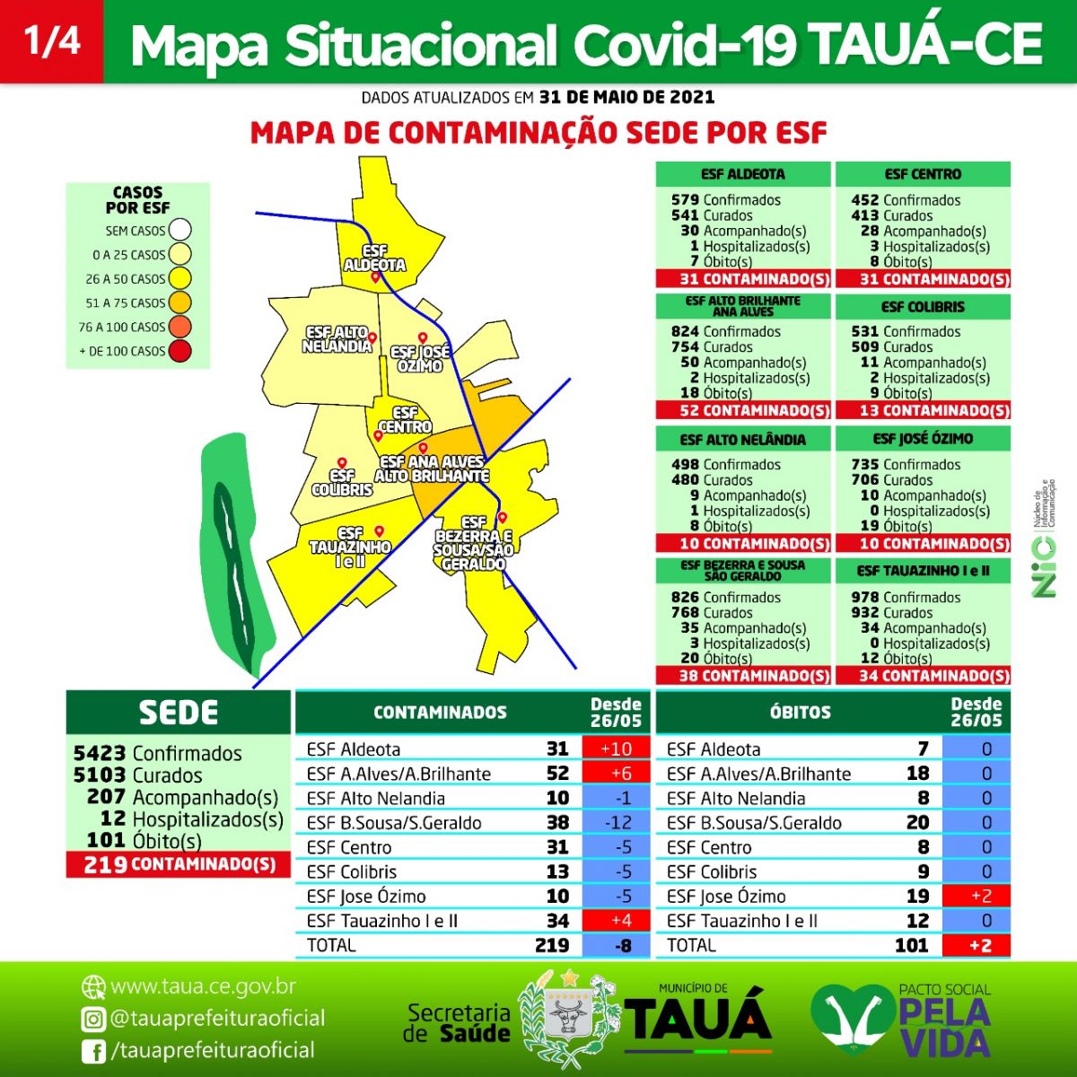 A Prefeitura Municipal de Tauá por meio da Secretaria de Saúde apresenta o quarto Mapa Situacional Covid-19. Os números foram atualizados no último dia 26 de maio, e trazem um retrato da pandemia por Bairro e Distrito.