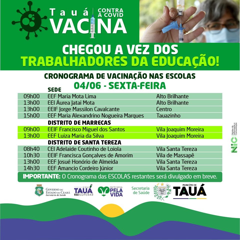 A Prefeitura de Tauá, por meio da Secretaria Municipal de Saúde, começa a vacinar os trabalhadores da Educação nesta sexta-feira (4). O início da imunização contra a Covid será em 10 escolas, quatro na sede, duas no distrito de Marrecas e quatro distrito de Santa Teresa. Cada unidade de ensino vacinará seus trabalhadores no próprio local. Na segunda-feira (7), a vacinação continuará em outras escolas.
