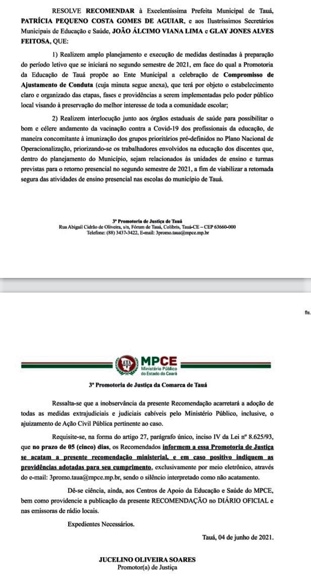 O Ministério Público da Comarca de Tauá emitiu Recomendações na tarde de hoje(04), aos Prefeitos de Tauá, Patrícia Aguiar, e de Arneiroz, Monteiro Filho, e os respectivos Secretários de Educação e Saúde, a realização de um planejamento para a retomada do ano letivo nas escolas municipais a partir do segundo semestre de 2021.