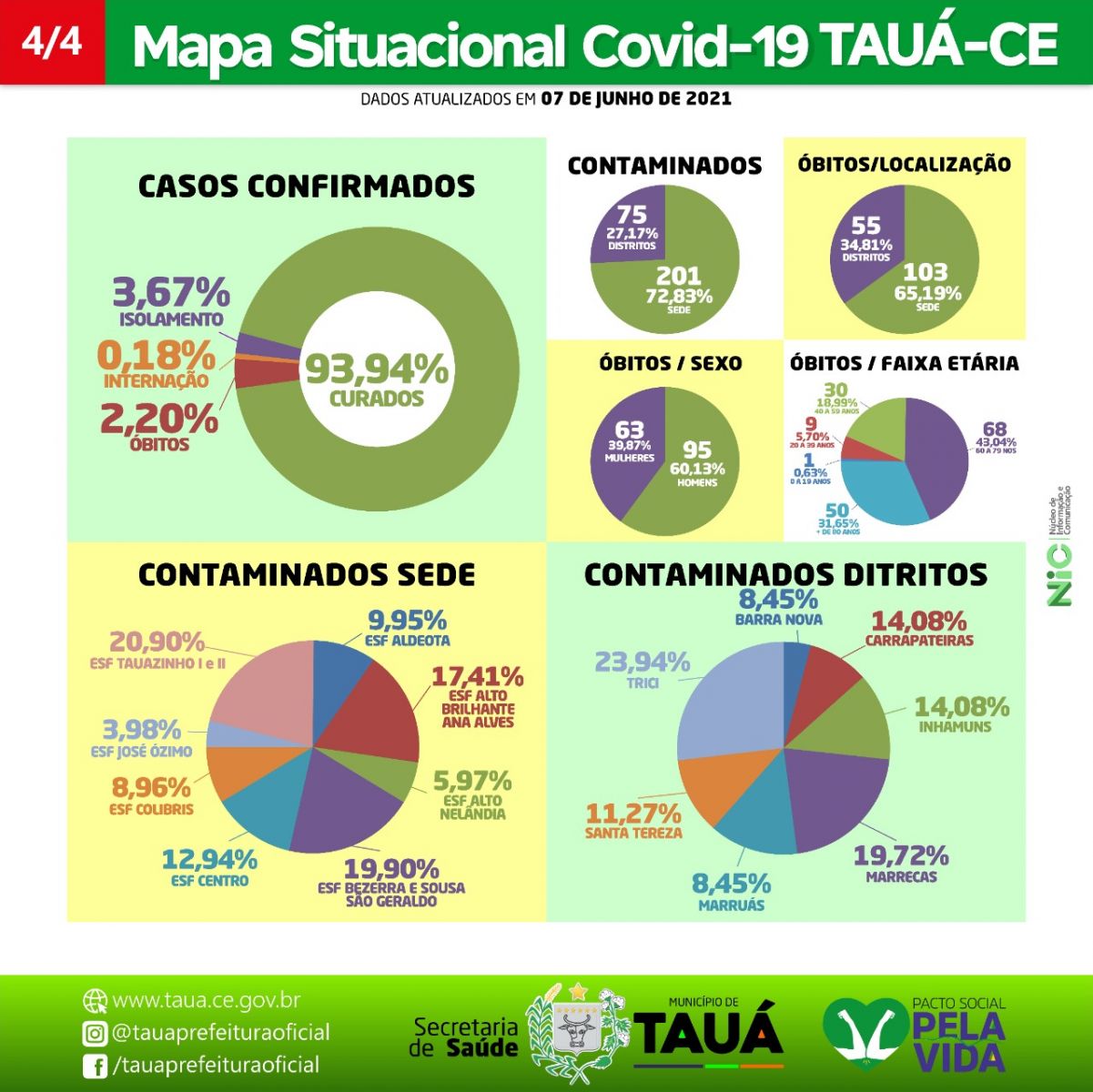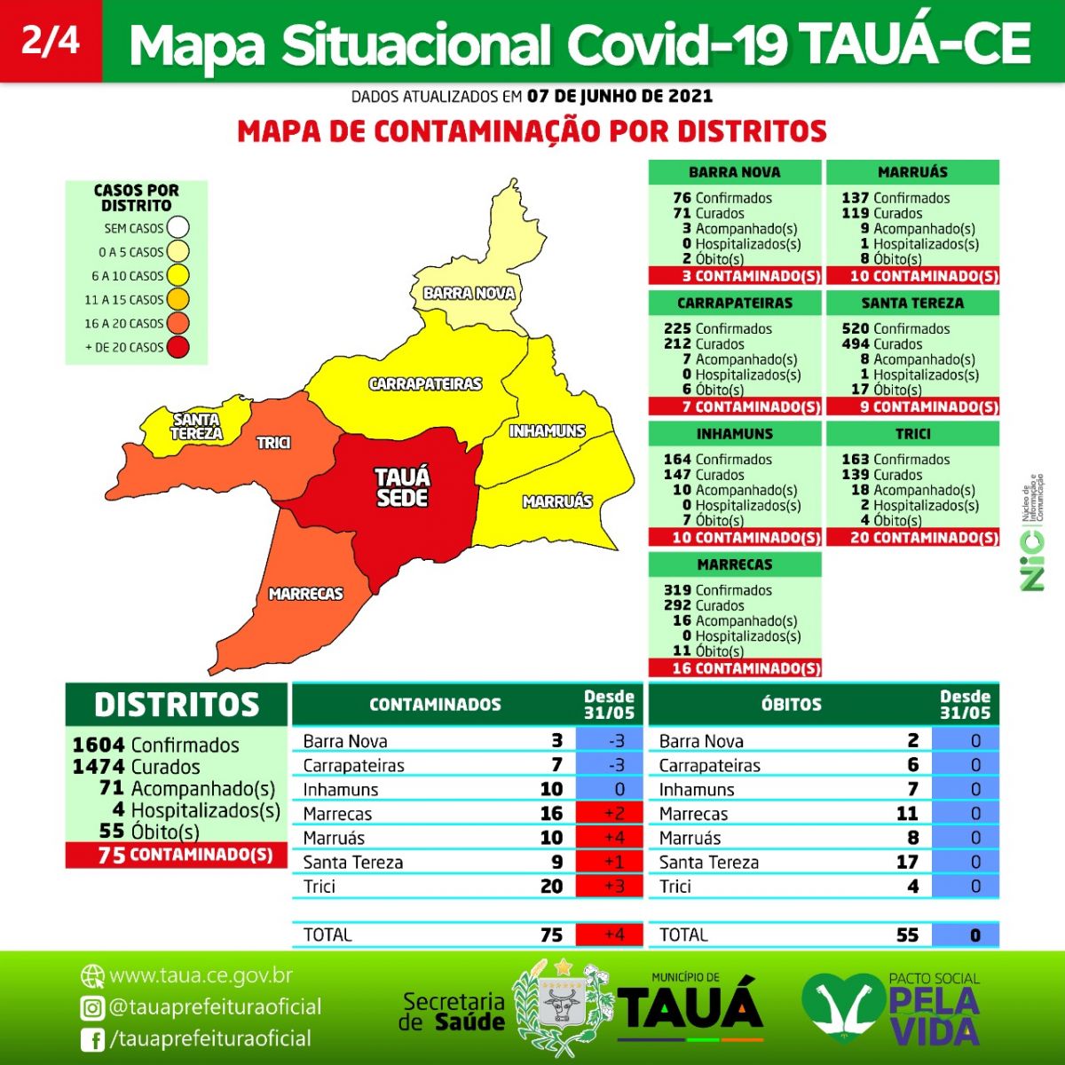 O Bairro Tauazinho passou a ter o maior foco de contaminação na cidade, com 42 casos (8 casos a mais que o índice do último mapa divulgado em 31 de maio). Já no interior permanece em primeiro lugar o Distrito de Trici com 20 casos.