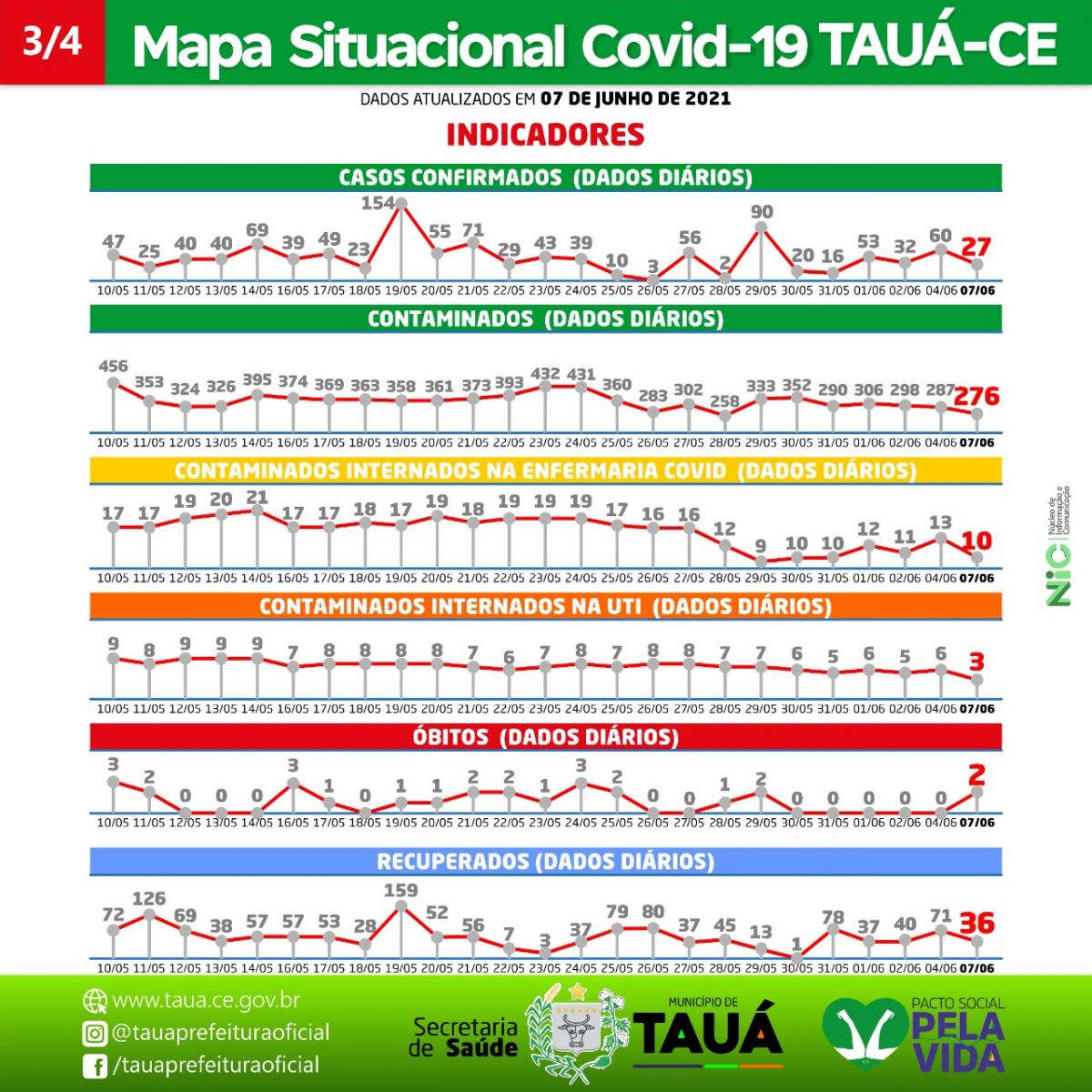 O Mapa Situação da Covid-19 divulgado na tarde de hoje(08), mostra a redução do número de internações de pacientes do Município de Tauá nesses últimos dias.