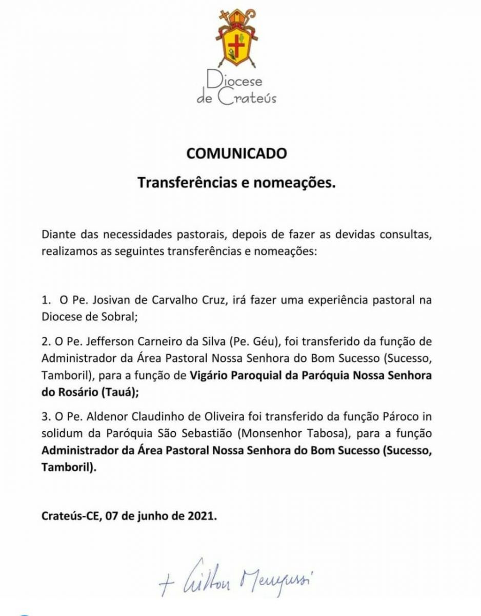 Por meio de comunicado oficial, Dom Ailton anunciou a transferência dos padres, Josivan de Carvalho, da Paróquia de Nossa Senhora do Rosário, em Tauá, para fazer uma experiência na Diocese de Sobral e Jefferson Carneiro da Silva(Géu), que deixará a Área Pastoral Nossa Senhora do Bom Sucesso, e assumirá a função de Vigário Paroquial de Tauá.
