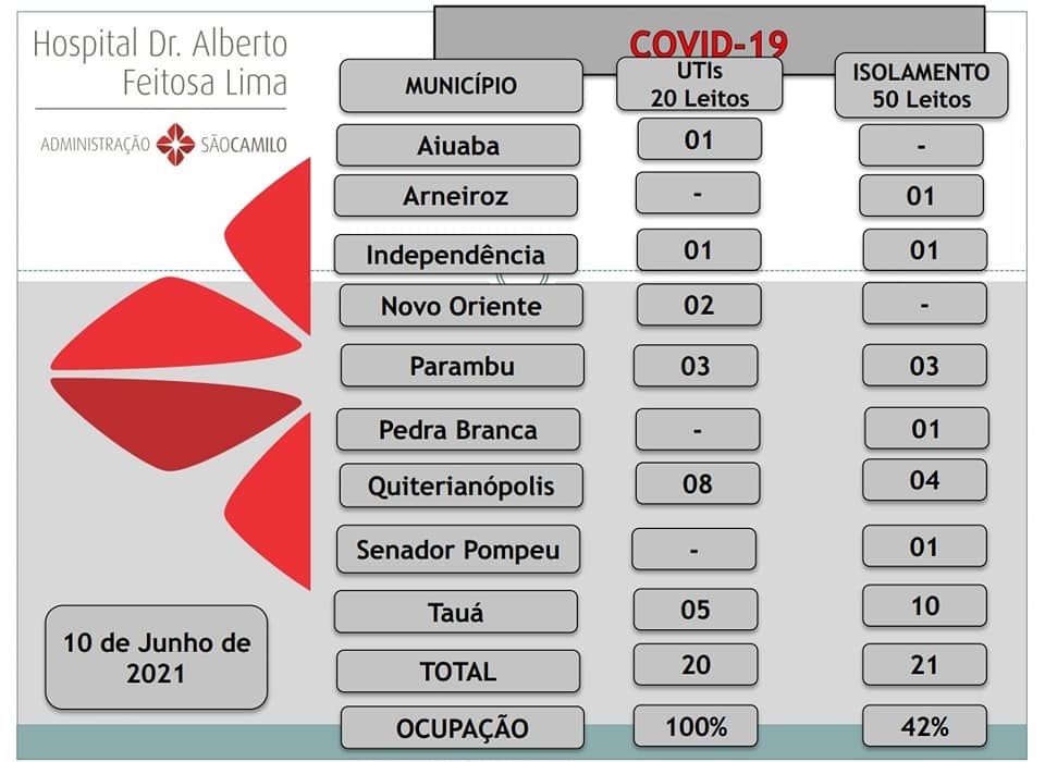 O Hospital Dr. Alberto Feitosa Lima, em Tauá, segue com 100% dos leitos de UTIs ocupados, mas sem fila de espera. A maior parte dos internados é do Município de Quiterianópolis.