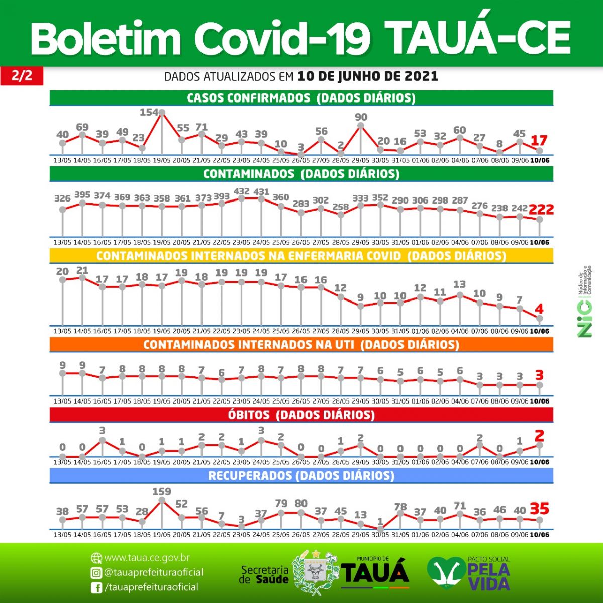 O Boletim Epidemiológico divulgado pela Secretaria de Saúde contabilizou mais 2 óbitos que estavam sob investigação no Município de Tauá e voltou a registrar queda nos números da pandemia da Covid-19. Com a confirmação, Tauá passa a somar 161 mortes pela doença.