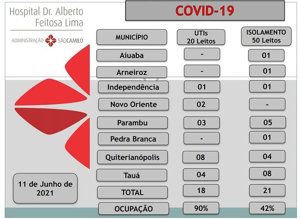 O Hospital Dr. Alberto Feitosa Lima divulgou Boletim na tarde de ontem(11), informando que a taxa de ocupação de leitos de UTI-Covid caiu para 90%, tendo 2 leitos disponíveis.