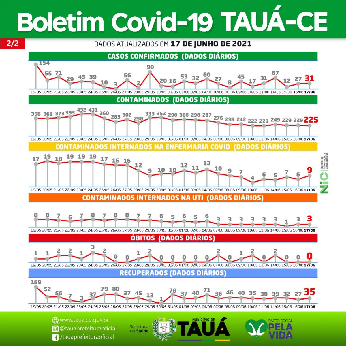 Atualmente, 225 pessoas estão infectadas, sendo 213 em isolamento domiciliar e 12 internados(9 na Enfermaria-Covid e 3 na UTI).