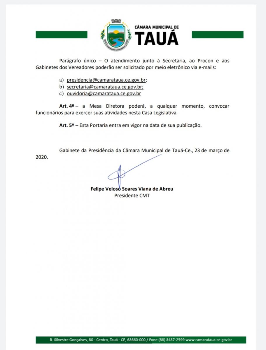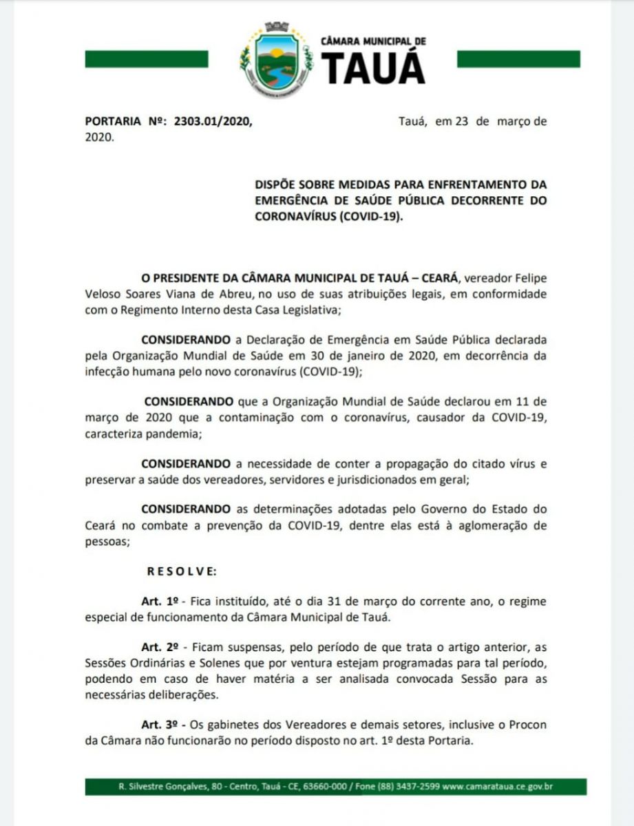 Portaria assinada na manhã desta segunda-feira(23), pelo Presidente da Câmara Municipal de Tauá, vereador Felipe Viana, suspende as atividades do Poder Legislativo.