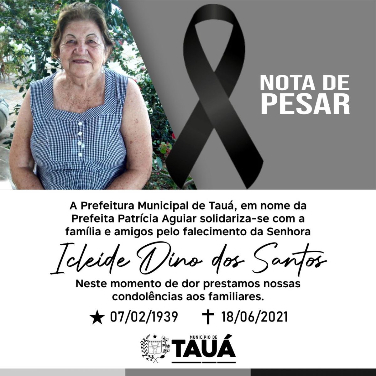 "É com grande pesar que a Prefeitura Municipal de Tauá em nome da Prefeita Patrícia Aguiar, solidariza-se com a partida da Sra. Icleide Dino dos Santos, natural do Distrito de Marrecas, genitora da Secretária Municipal de Planejamento Vanja Gonçalves.