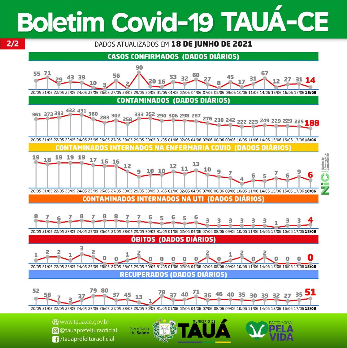 Atualmente, 188 pacientes estão contaminados no município, uma redução de 70% em comparação ao dia 03 de maio último, quando Tauá tinha 674 infectados. 174 pessoas estão em isolamento domiciliar e 10 hospitalizados(6 na Enfermaria-Covid e 4 na UTI).
