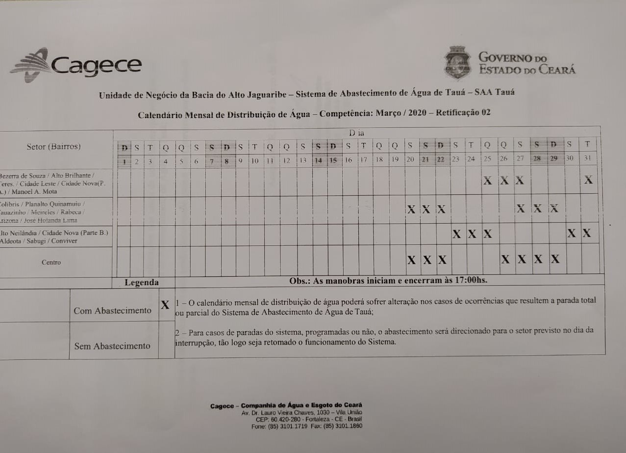 A Cagece divulgou nesta segunda-feira(23), um novo cronograma de abastecimento dos bairros de Tauá nesta segunda(23), após a cidade ter ficado em colapso por quase 3 dias. O sistema adutor foi paralisado na quarta-feira(18) e só foi reestabelecido no início da noite de sexta(20).