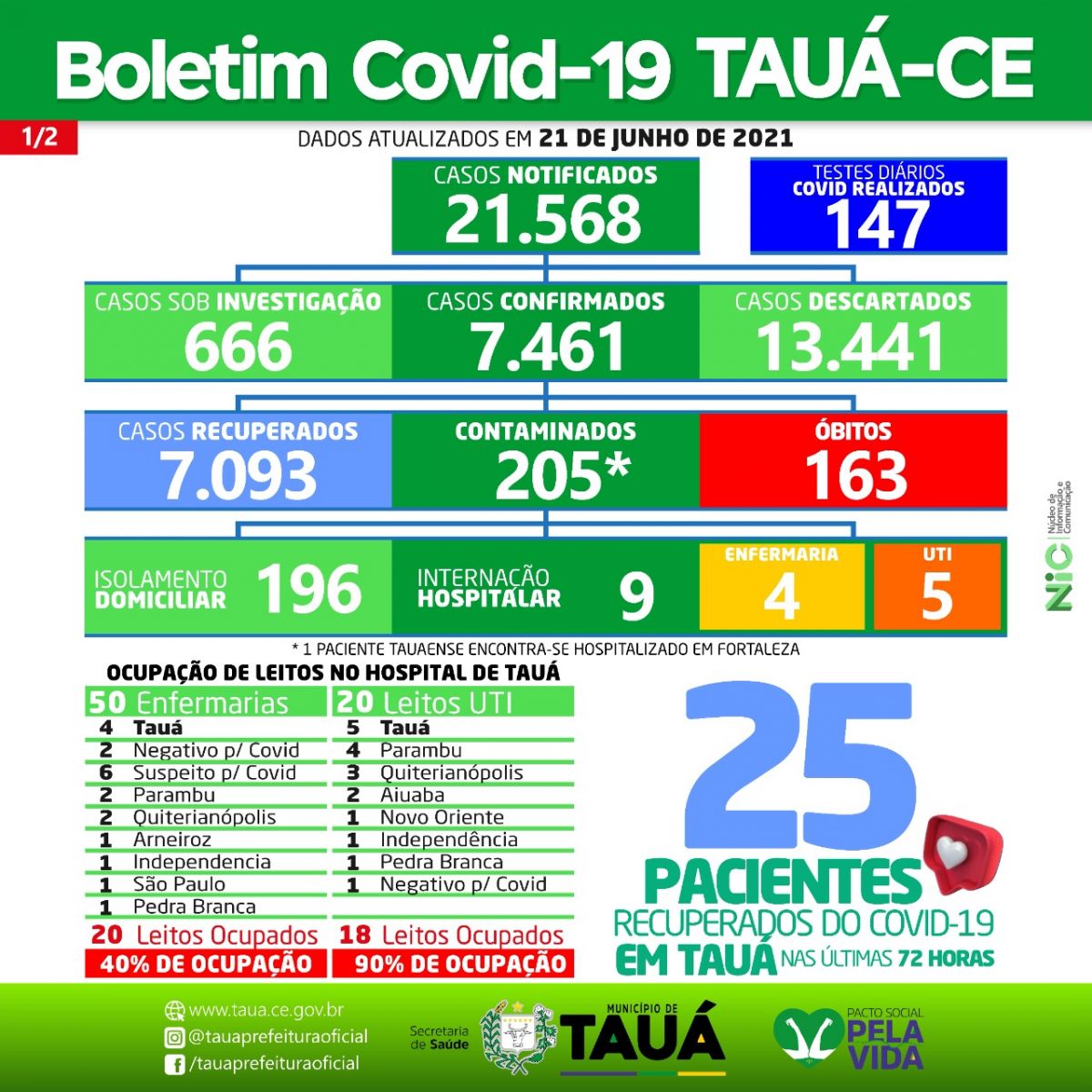 O Boletim Epidemiológico divulgado na noite de hoje(21) pela Secretaria de Saúde não registrou óbito e teve 25 pessoas recuperadas da Covid-19 no Município de Tauá. A última morte registrada ocorreu o dia 14 de junho e o número permanece em 163.