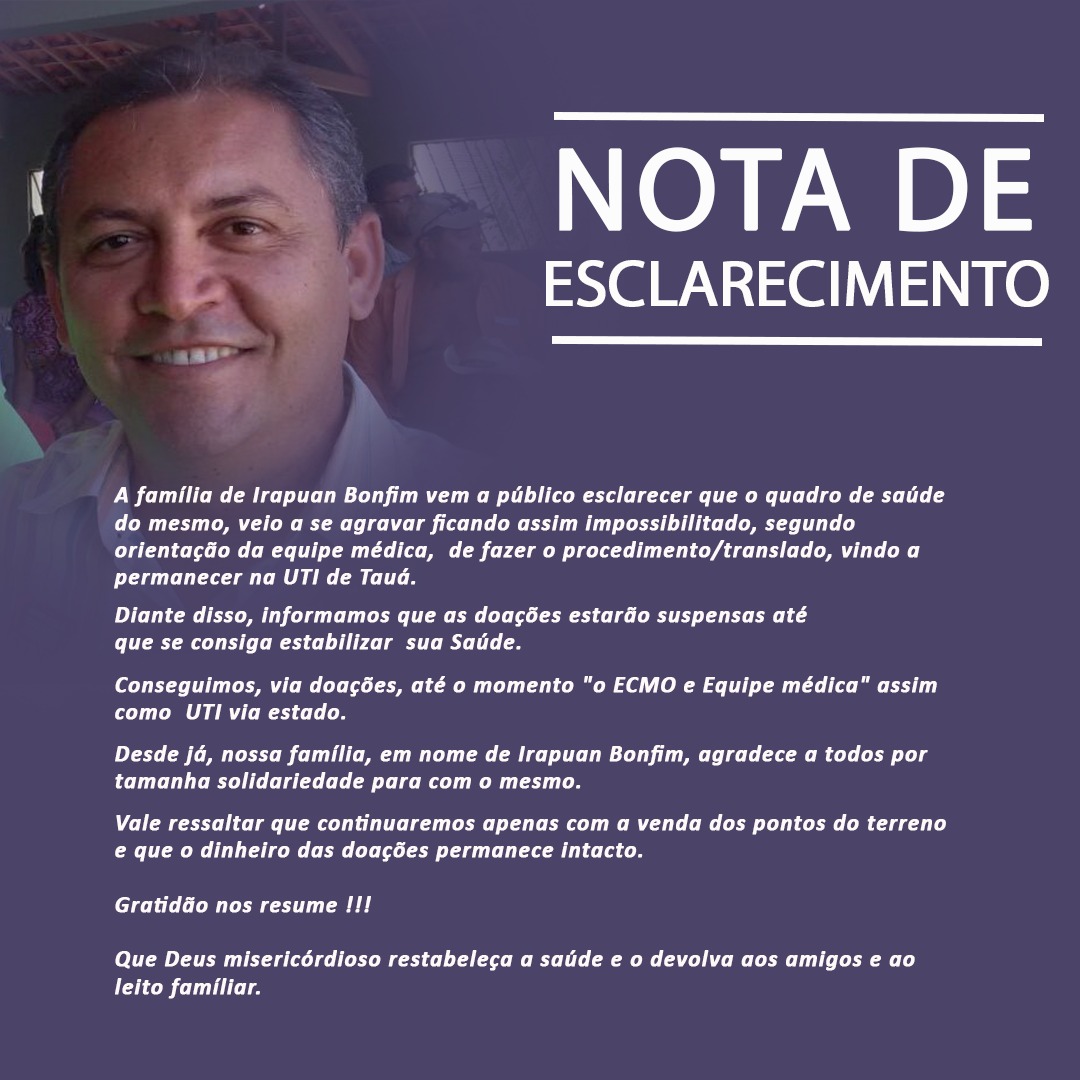 A família do ex-vereador e servidor público do Município de Quiterianópolis, Irapuan Bonfim, que está internado na UTI-Covid do Hospital de Tauá, divulgou Nota de Esclarecimento nesta terça-feira(22), suspendendo a campanha de arrecadação de dinheiro para custear o tratamento com o uso do equipamento ECMO, devido a impossibilidade de transferência do paciente para um Hospital particular em Fortaleza, porque o seu estado de saúde se agravou e por orientação médica, ele permanecerá hospitalizado em Tauá.
