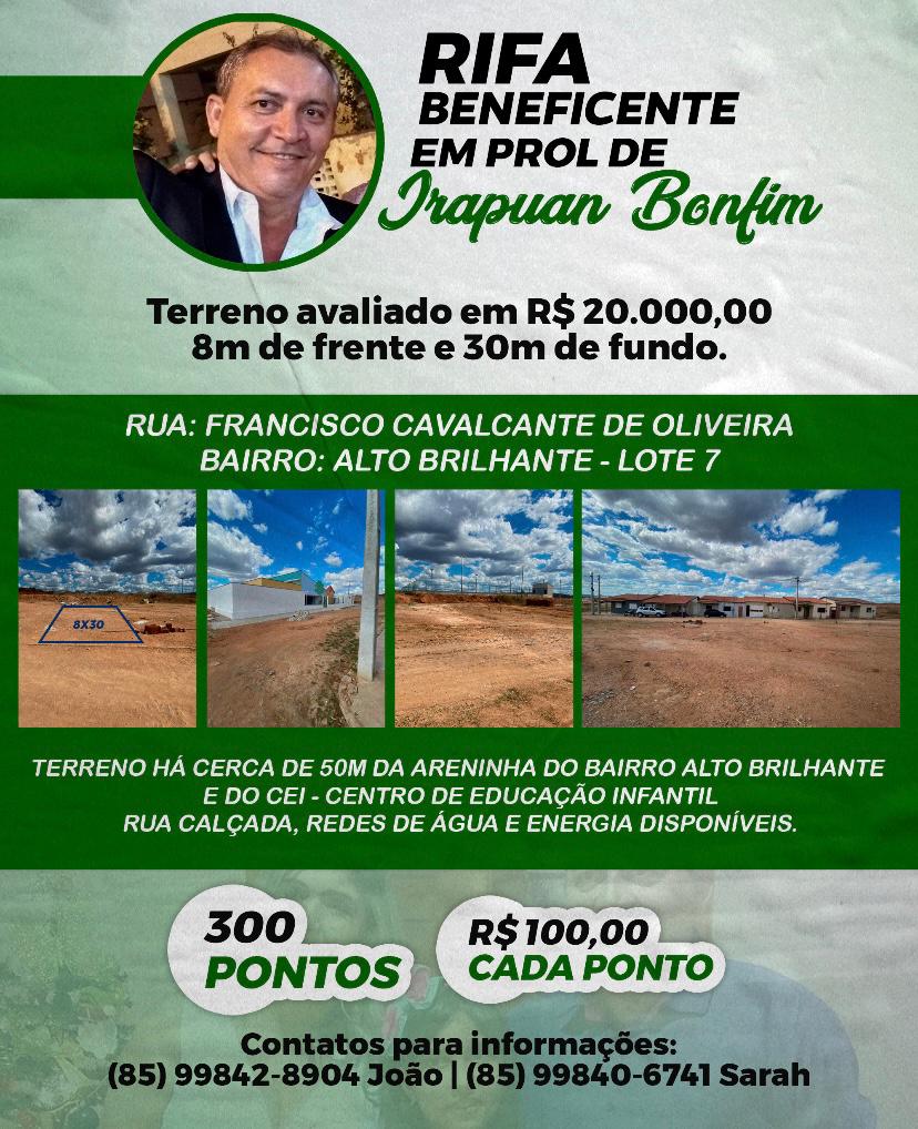 Ao anunciar a suspensão da campanha de arrecadação de dinheiro via conta bancária ou transferência por meio do PIX, até que o ex-vereador tenha seu quadro clínico estabilizado, a família informou ao Blog do Wilrismar, que estará realizando uma rifa de um terreno na cidade de Quiterianópolis, avaliado em R$ 20 mil. O ponto na rifa custa R$ 100,00.