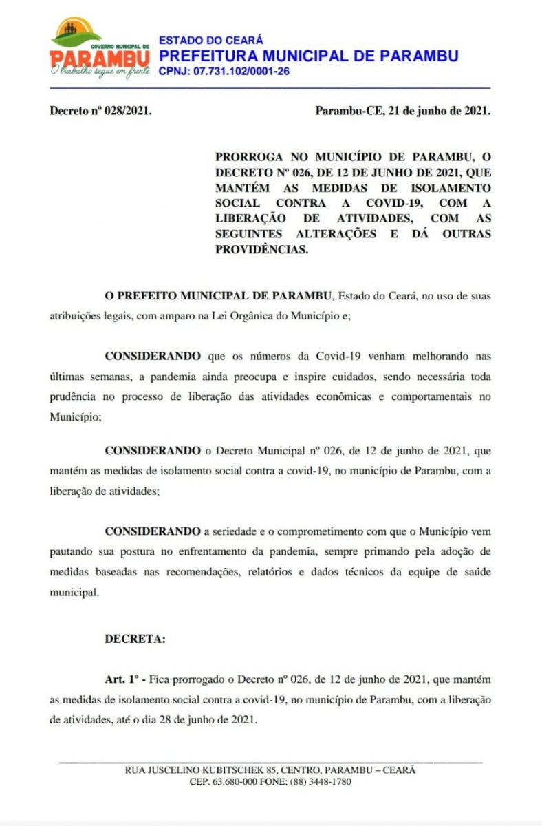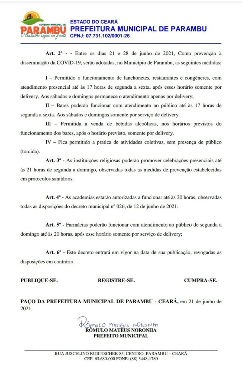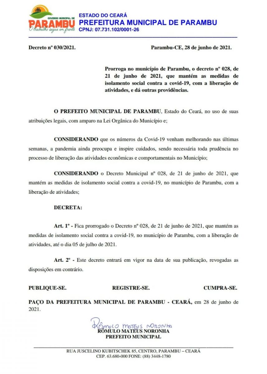 O Prefeito de Parambu, Rômulo Noronha, prorrogou hoje(28), o Decreto Municipal que flexibiliza as medidas de Isolamento Social Rígido que libera o funcionamento de atividades comerciais, esportivas e religiosas. A medida irá vigorar até o dia 5 de julho.