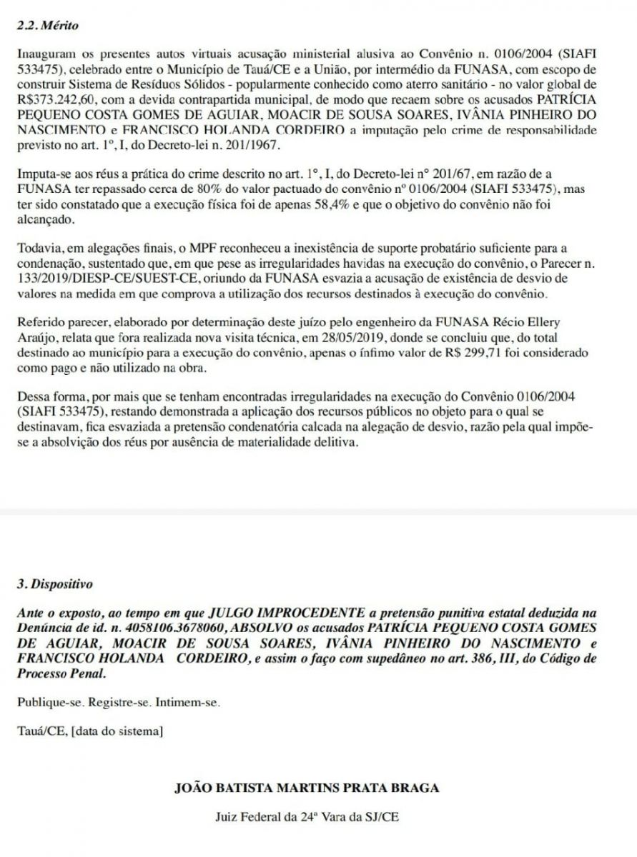 A ação foi ofertada em 2018, a partir de uma Notícia de Fato apresentada ao Ministério Público Federal, por adversários políticos da gestora e refere-se ao suposto descumprimento de um convênio entre a Funasa e a Prefeitura de Tauá, para a construção do Aterro Sanitário.