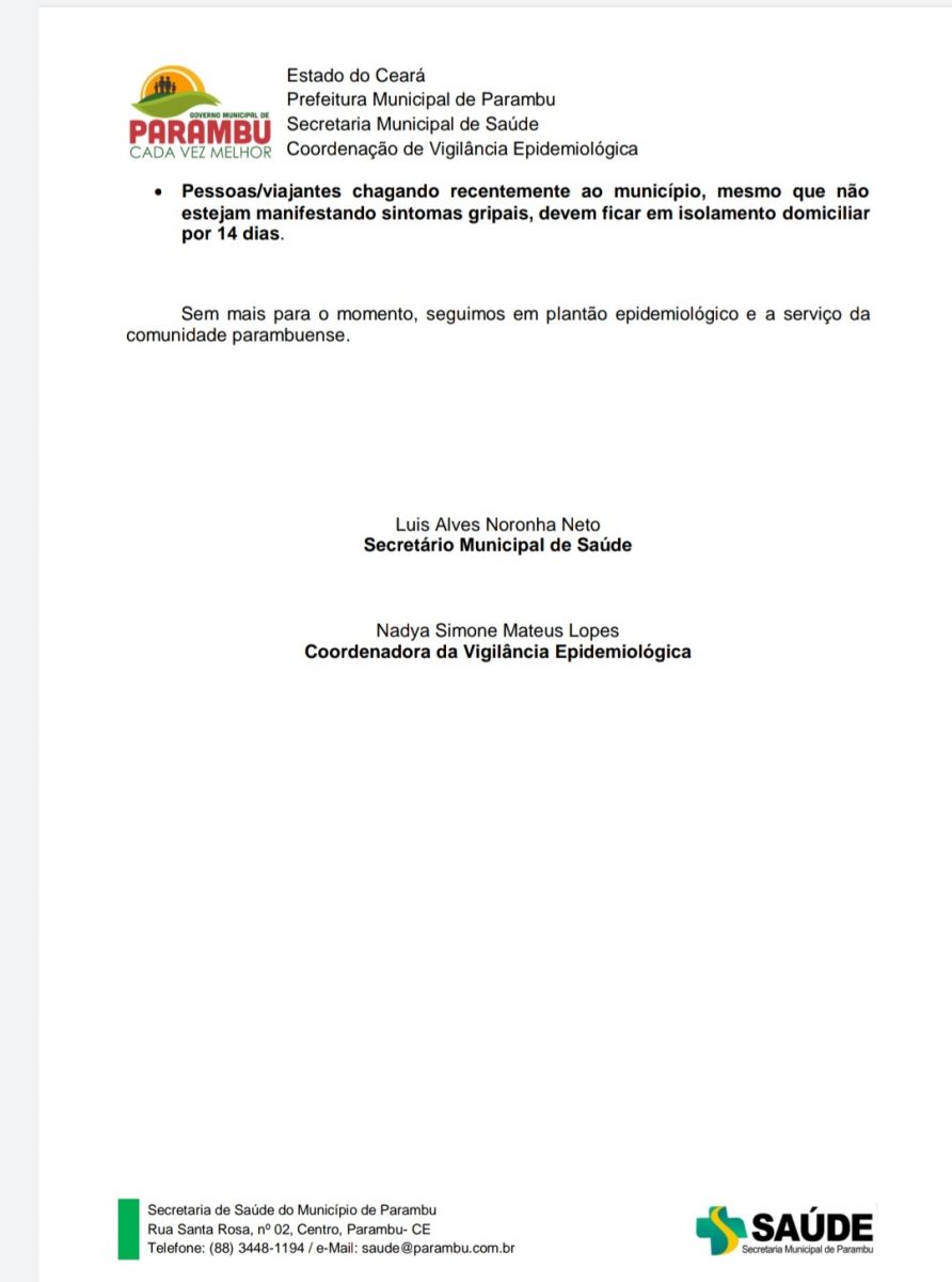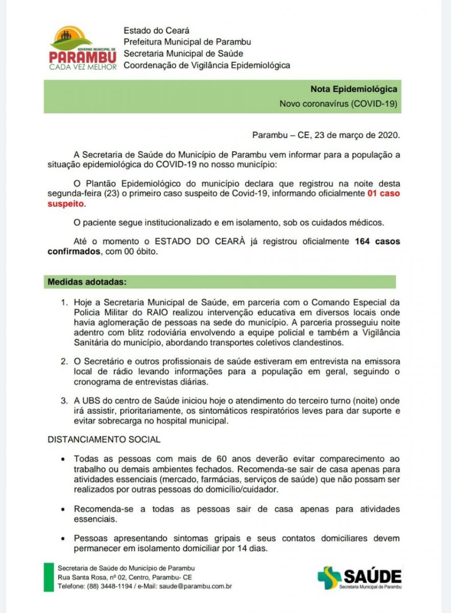 Foi registrado o primeiro caso suspeito de coronavírus no município de Parambu, segundo Nota Epidemiológica divulgada ontem(23), pela Secretaria de Saúde.
