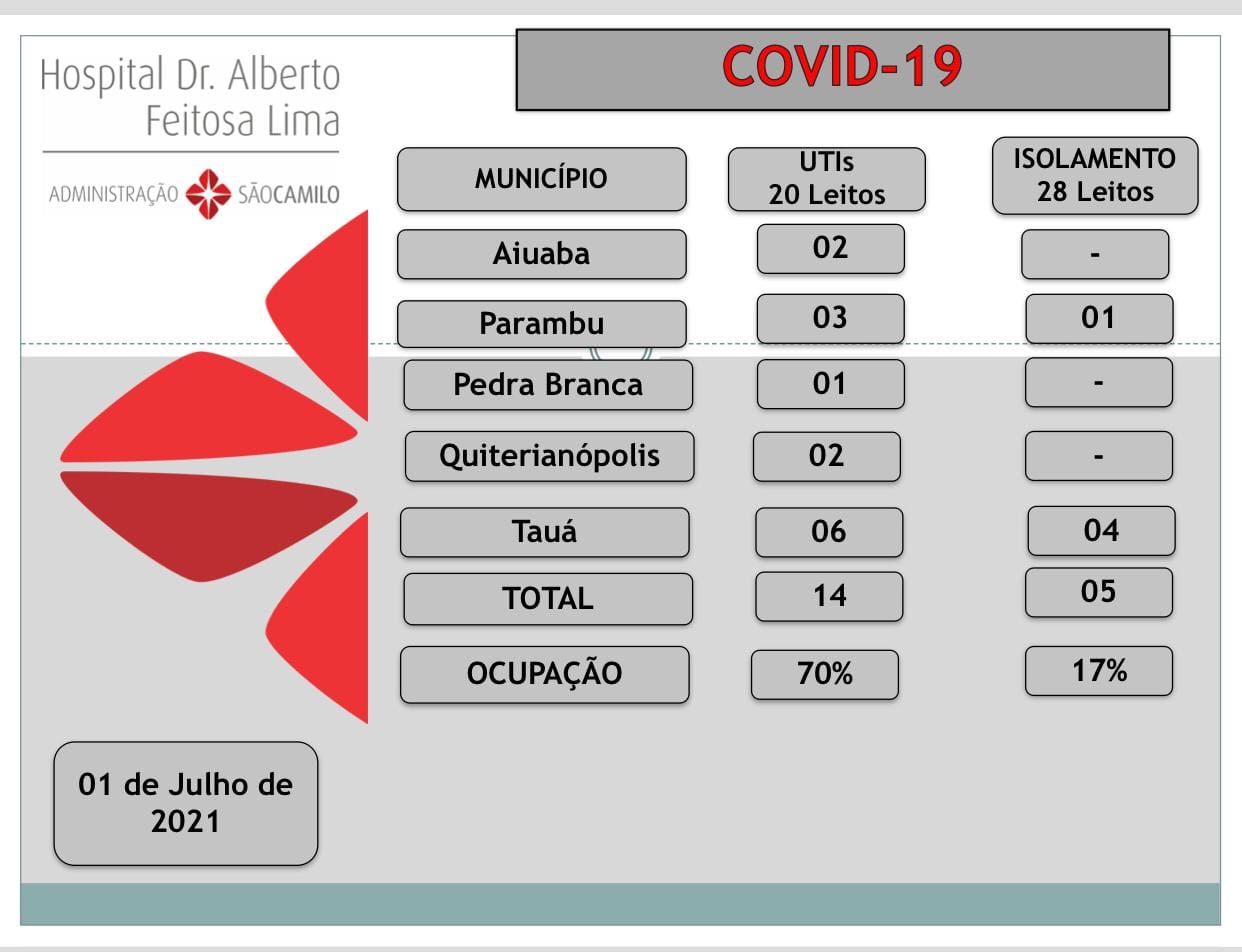 Já o boletim hospitar informa a redução na taxa de ocupação de leitos de UTI-Covid no Hospital Dr. Alberto Feitosa Lima. Tauá tem o maior número de internados(6 na UTI e 4 na Enfermaria).