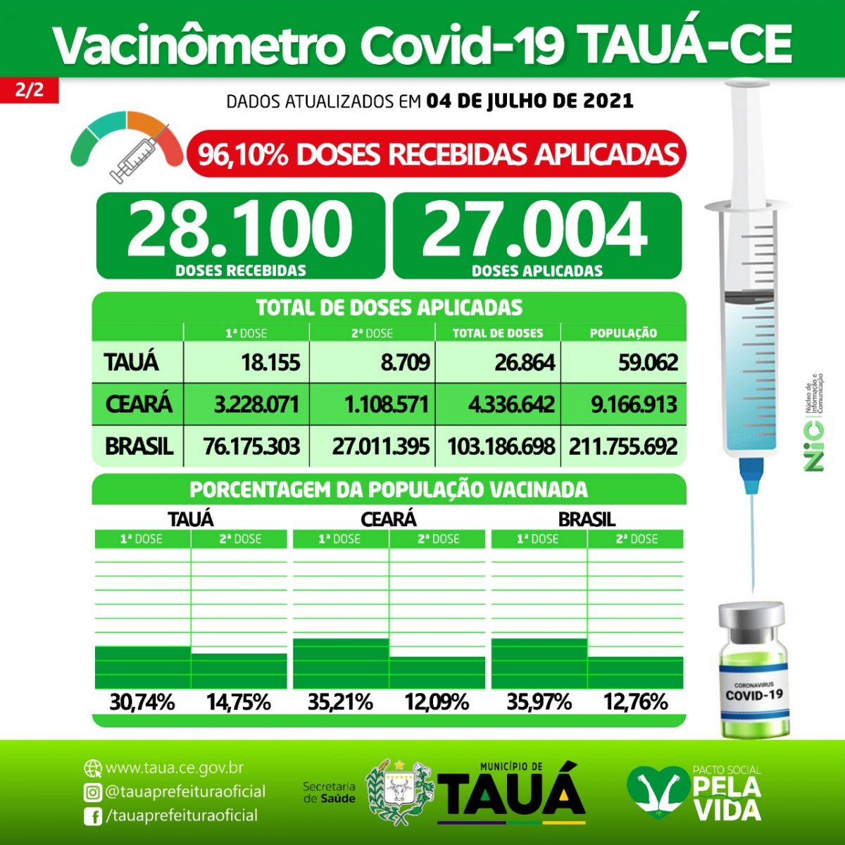 O município de Tauá aplicou 96,10% das doses de vacinas contra a Covid recebidas. É o que informa o vacinômetro divulgado neste domingo(04).