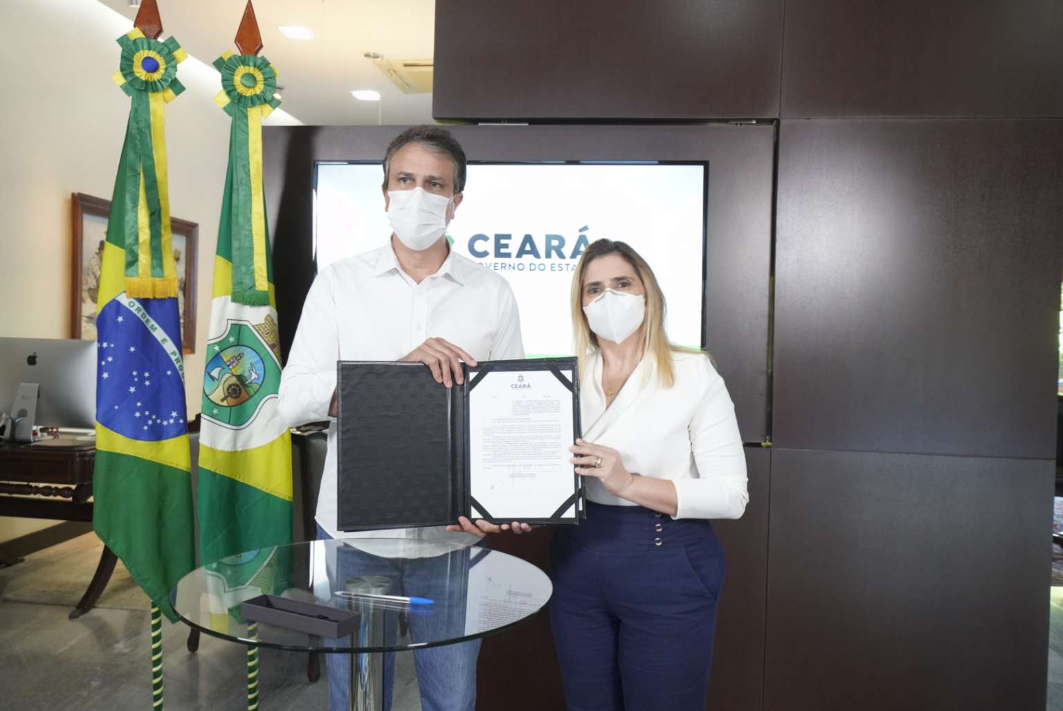 O governador do Ceará, Camilo Santana, sancionou, na tarde desta segunda-feira (5), a lei que autoriza o Poder Executivo do Ceará a adquirir e a ceder notebooks aos professores da rede estadual de ensino a fim de assegurar condições para a criação de conteúdos e a prática de atividades necessárias à aprendizagem remota. Com isso, a Secretaria da Educação (Seduc) vai comprar 28 mil notebooks, destinados a professores efetivos e temporários. Participaram da assinatura a secretária da Educação, Eliana Estrela, de forma presencial, e a vice-governadora, Izolda Cela, de forma remota.