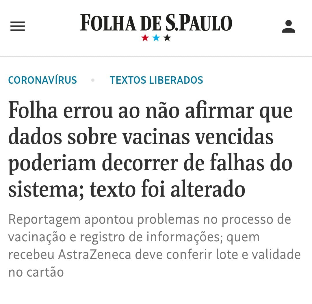 O veículo também disse que alterou o título original da matéria "Milhares no Brasil tomaram vacina vencida contra a Covid; veja se você é um deles" para "Registros indicam que milhares no Brasil tomaram vacina vencida contra a Covid; veja se você é um deles".