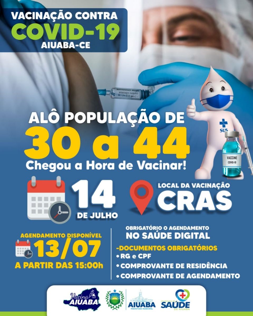A população do Município de Aiuaba na faixa etária de 30 a 44 anos, começará a ser vacinada a partir de quarta-feira(14). A informação foi divulgada hoje(12), pela Secretaria de Saúde.