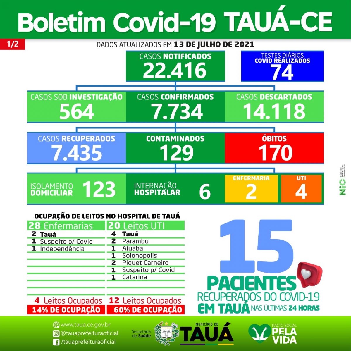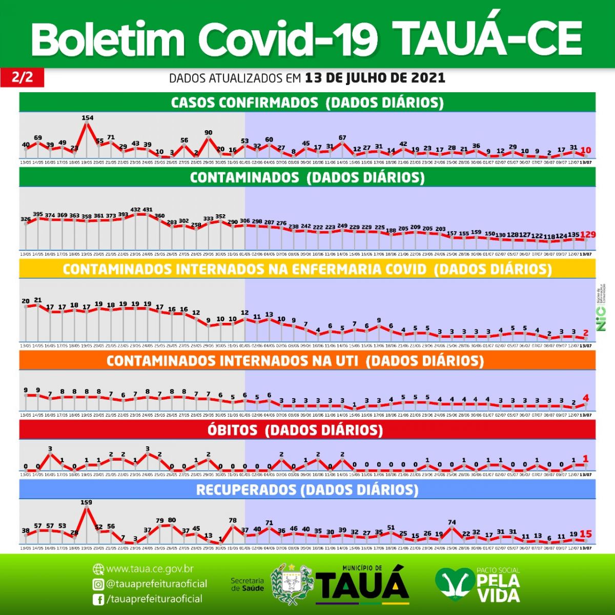 O Município de Tauá atinge a marca de 170 mortes provocadas pelo Coronavírus desde o início da pandemia em março de 2020. A informação é da Secretaria de Saúde por meio do Boletim Epidemiológico divulgado na noite de hoje(13).