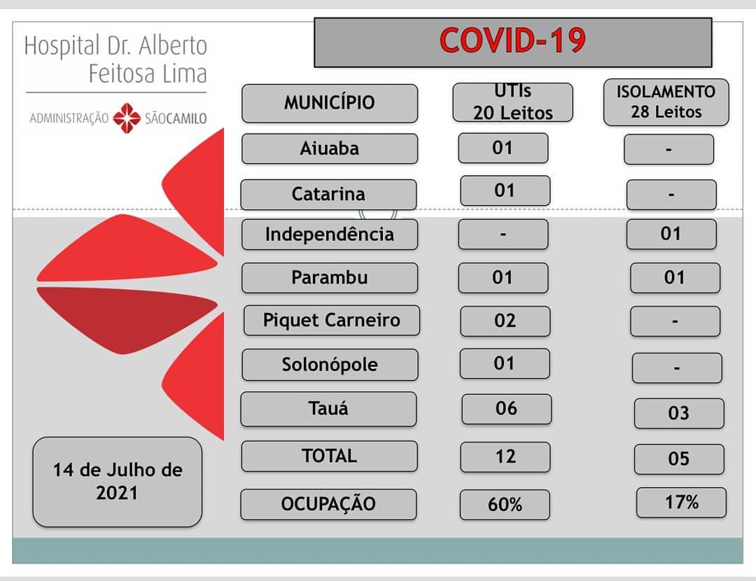 A Taxa de ocupação de leitos de UTI-Covid no Hospital de Tauá segue em 60%. Dos 20 leitos, 12 estão ocupados, sendo 06 pacientes de Tauá.